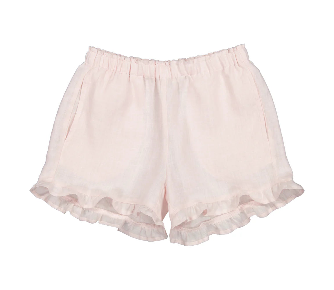 Summer shorts with ruffle details and side pockets. The shorts have elastic at the waist for a comfortable fit.