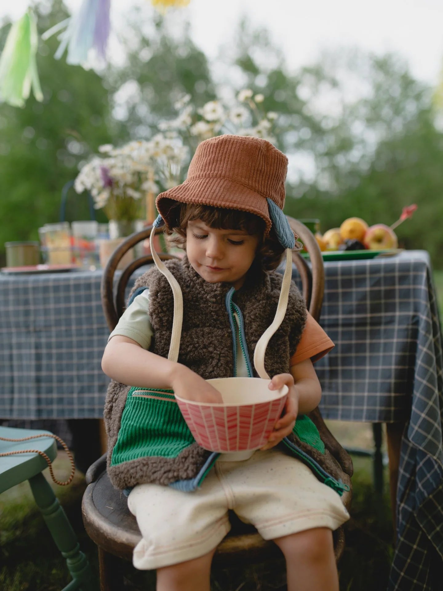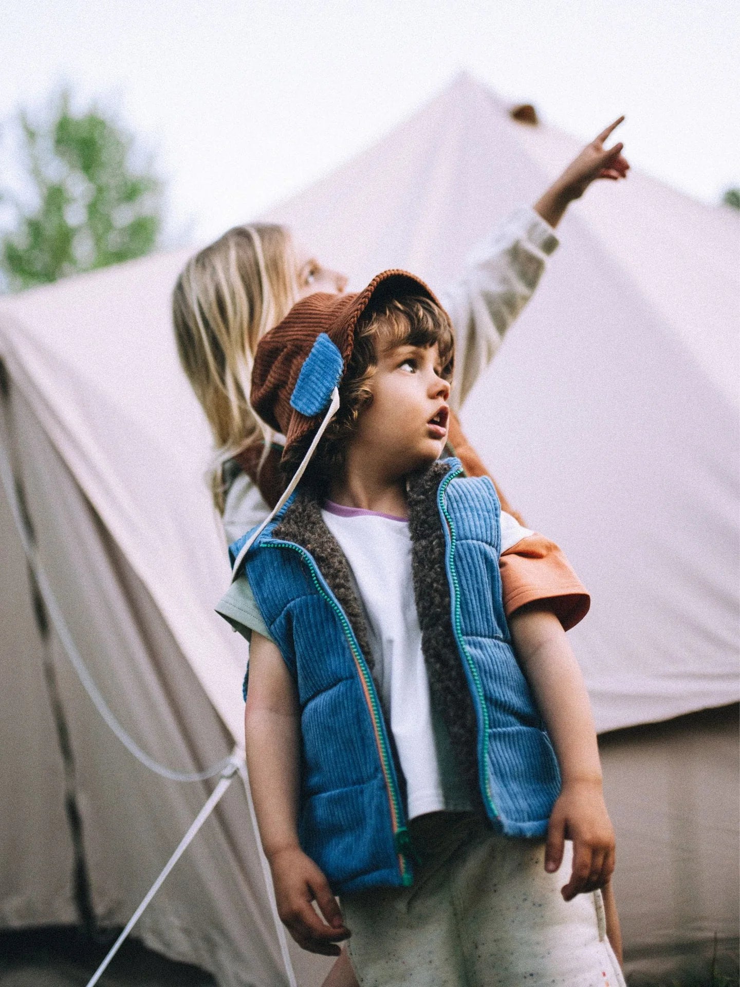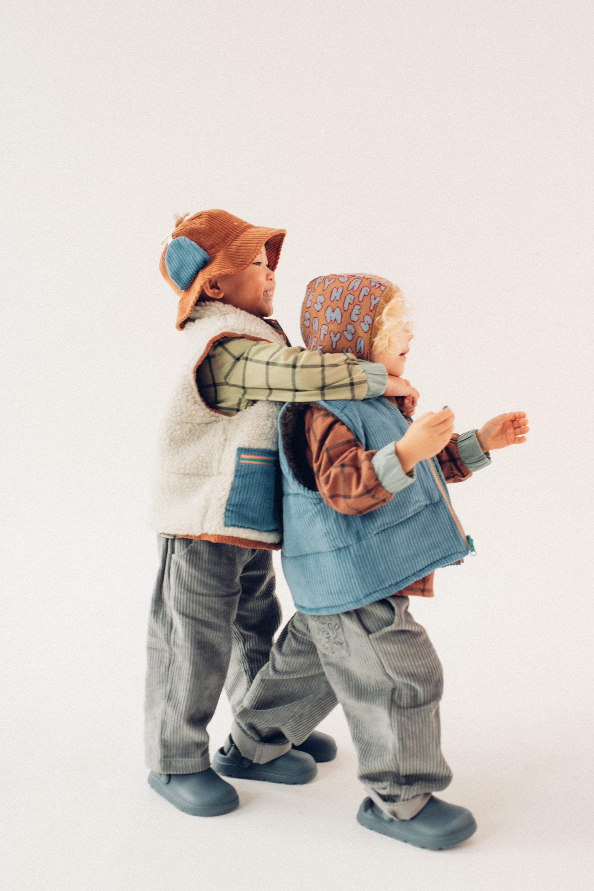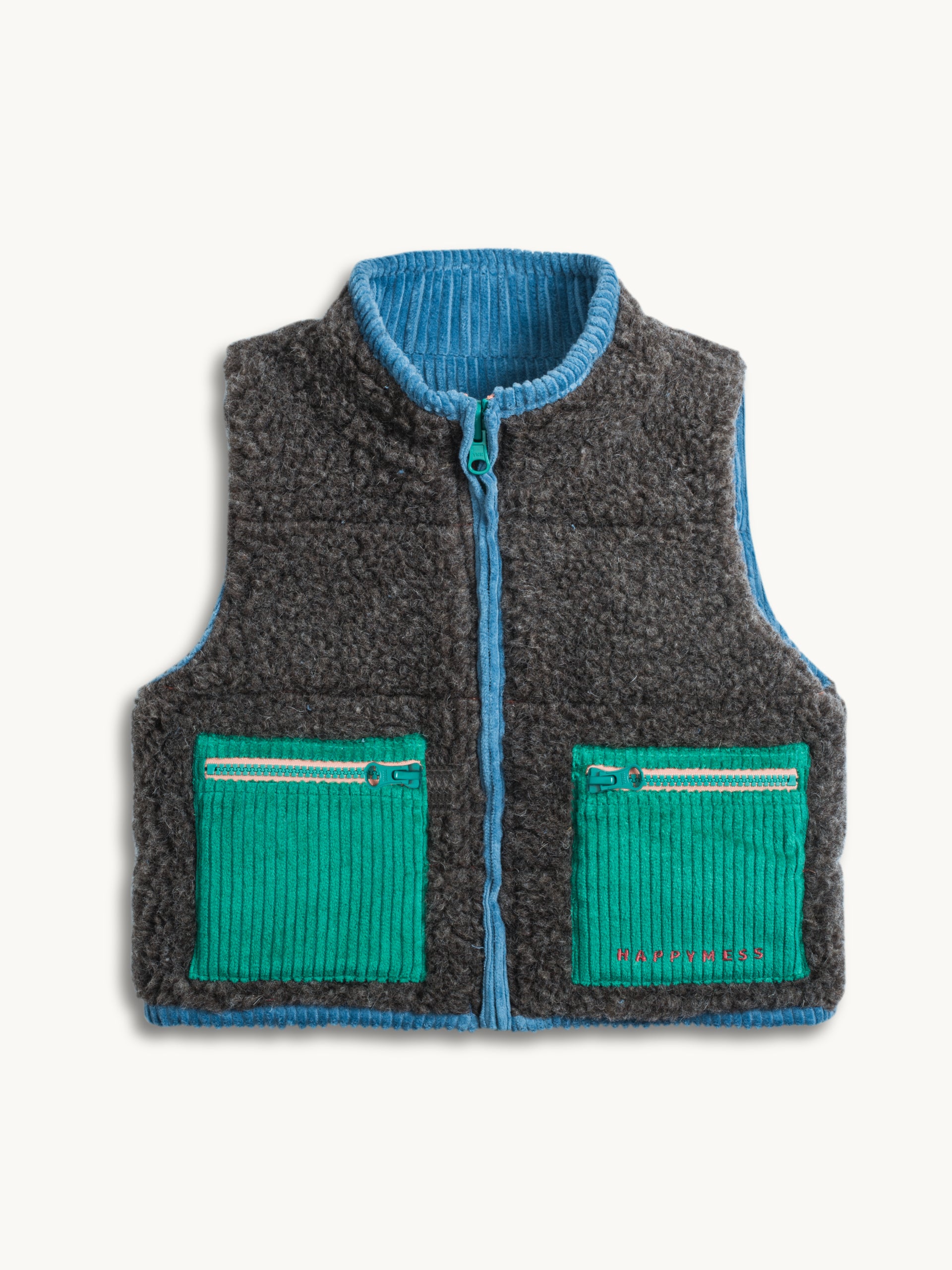 შექცევადი მერინოს და კორდუს ჟილეტი მოყვება მხიარული ნაქარგები ზურგზე. შექმნილია ზამბარიანი ჯიბეებით შალის მხარეს და ფარული ჯიბეებით ბამბის მხარეს.