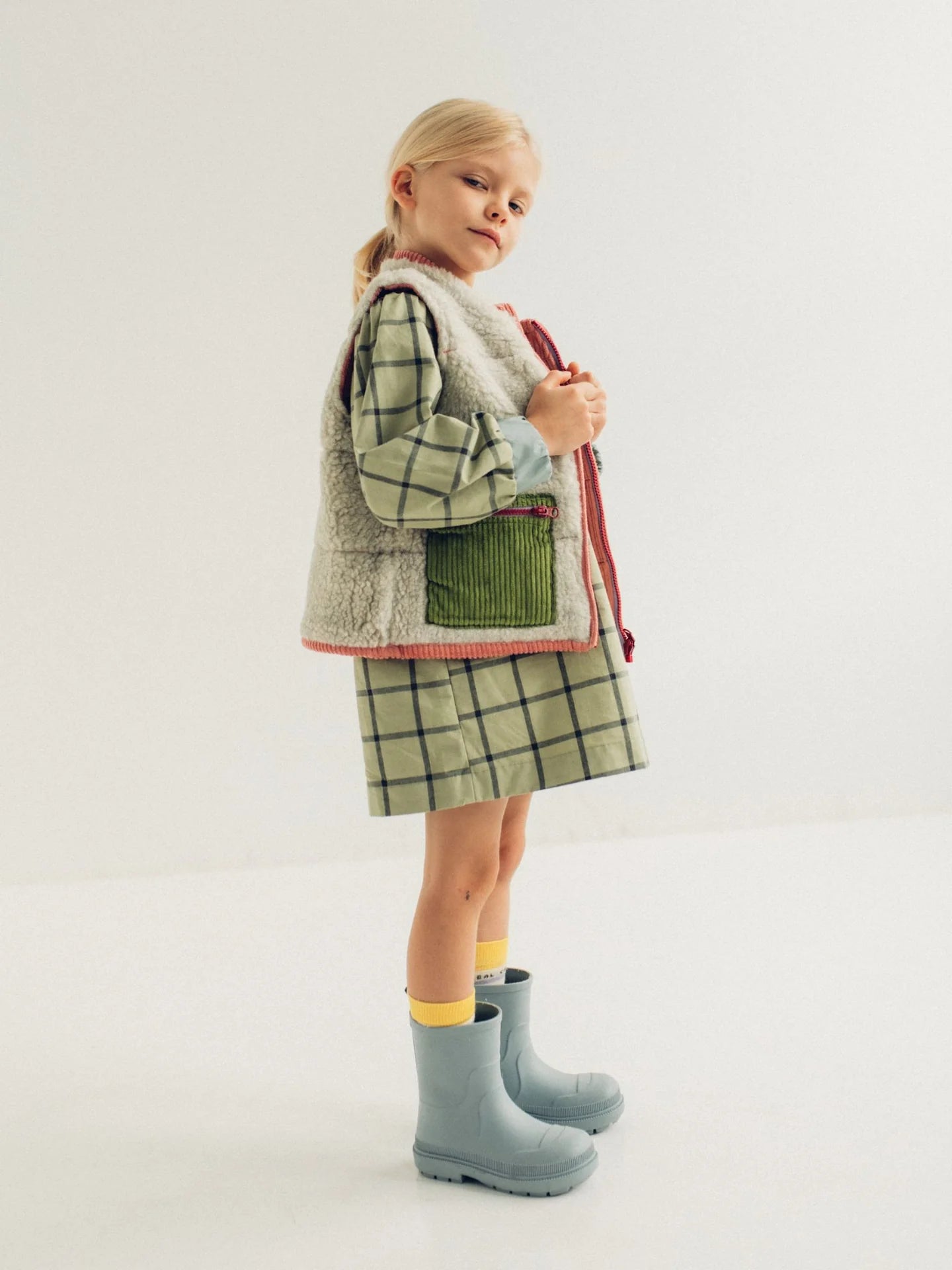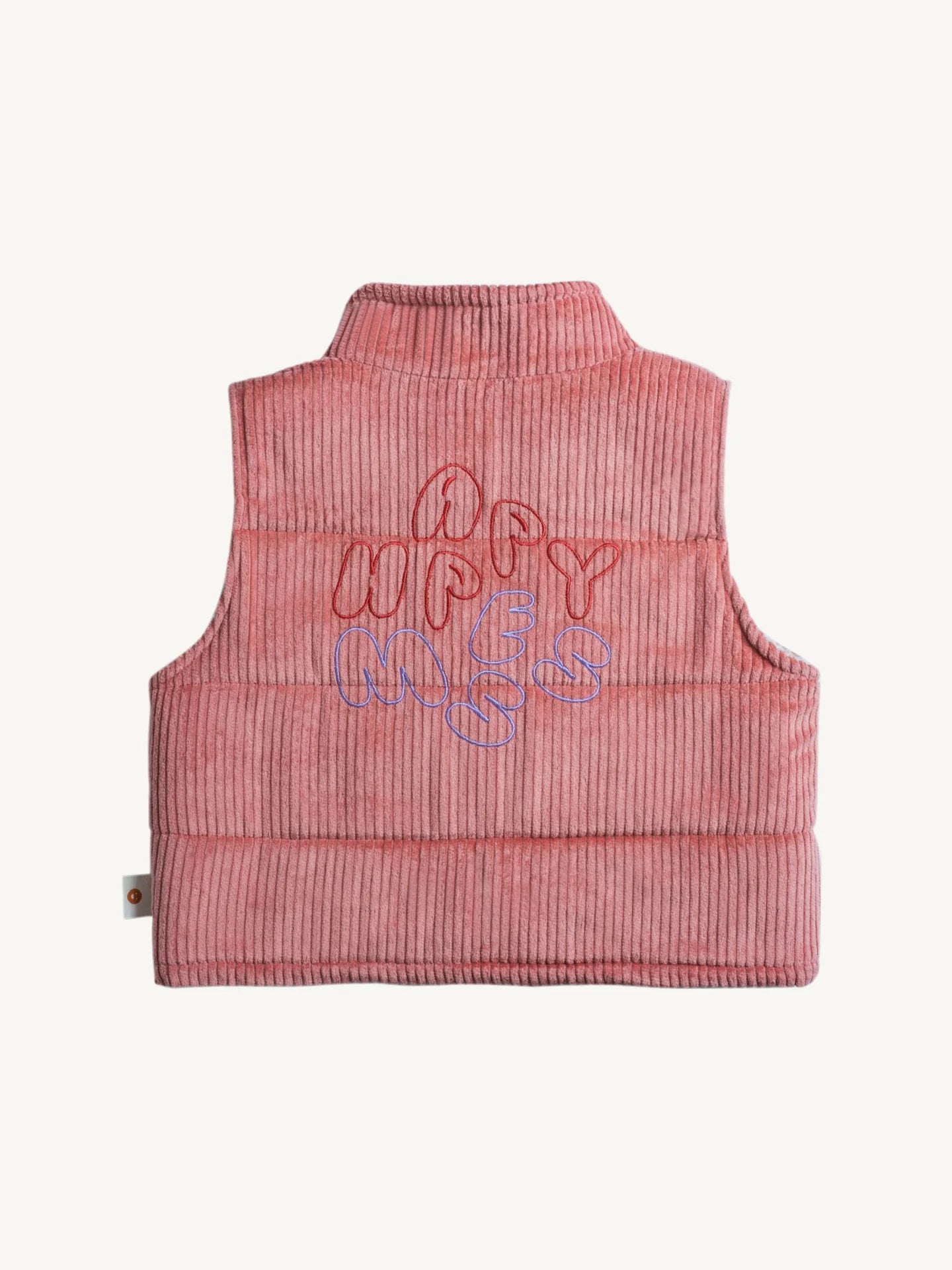 შექცევადი მერინოს და კორდუს ჟილეტი მოყვება მხიარული ნაქარგები ზურგზე. შექმნილია ზამბარიანი ჯიბეებით შალის მხარეს და ფარული ჯიბეებით ბამბის მხარეს.