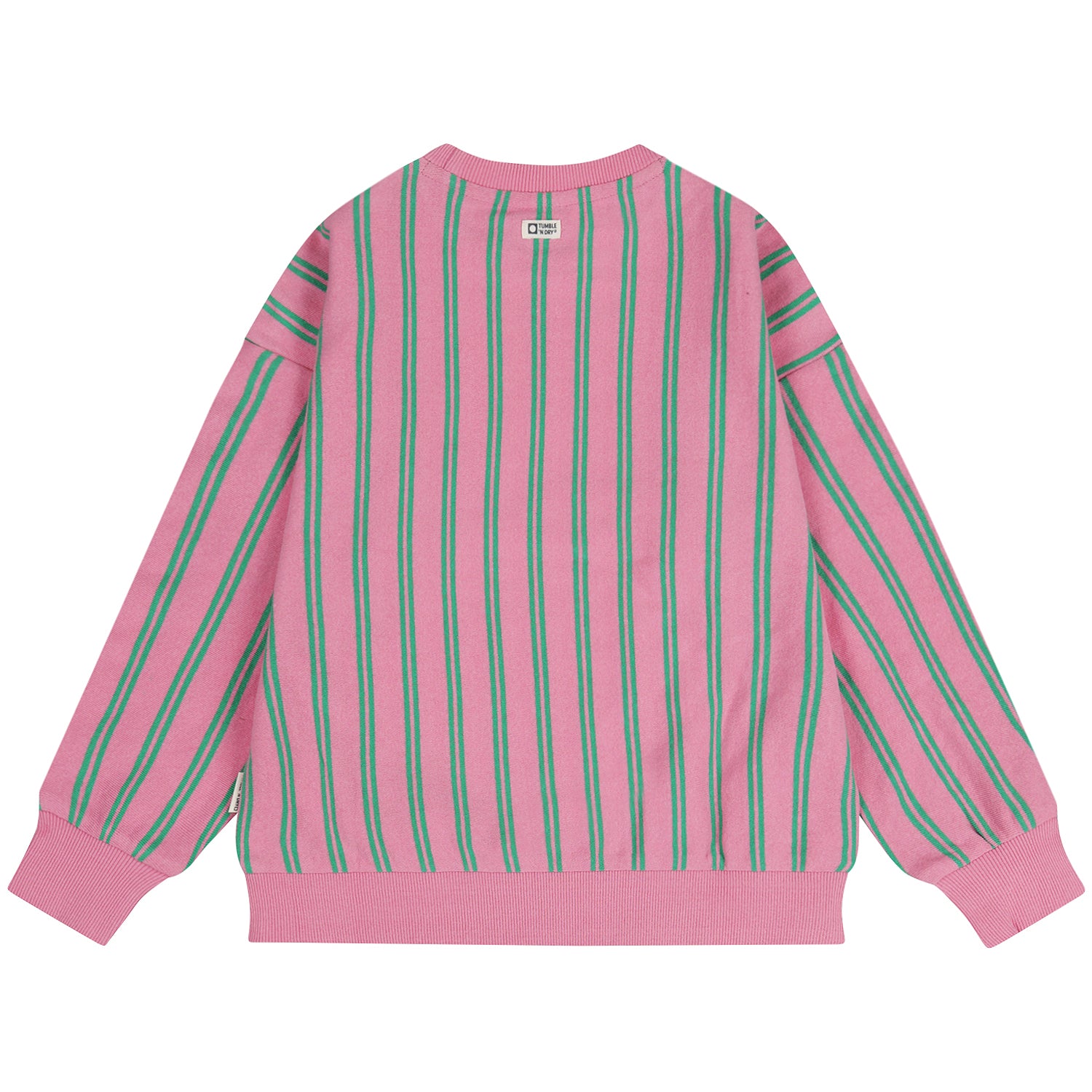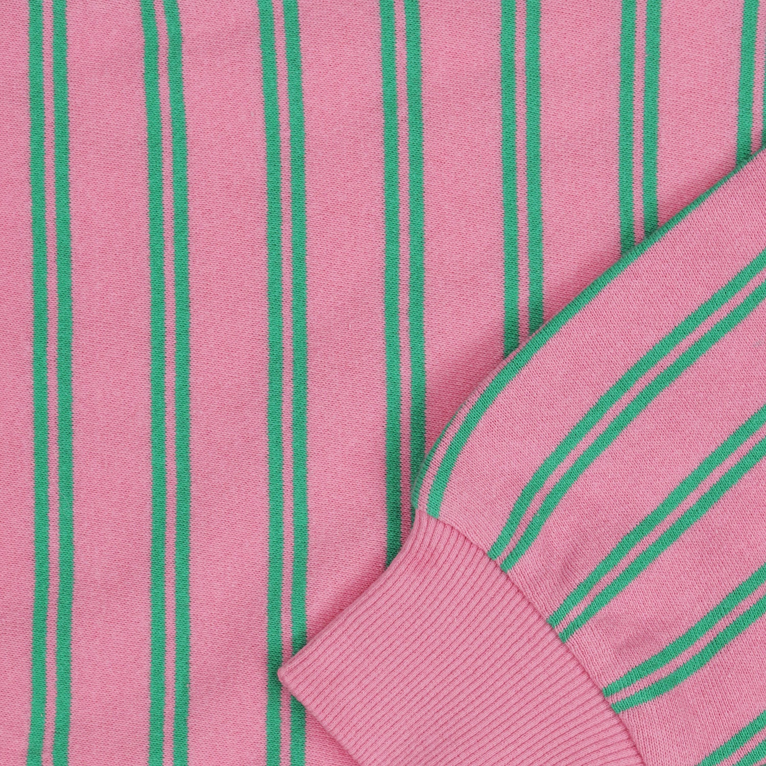 This comfortable sweater is a must-have for girls. Made from 100% recycled cotton, it offers a sustainable choice without compromising on style. The item comes in a cheerful pink color with green stripes that provide a playful and eye-catching look.