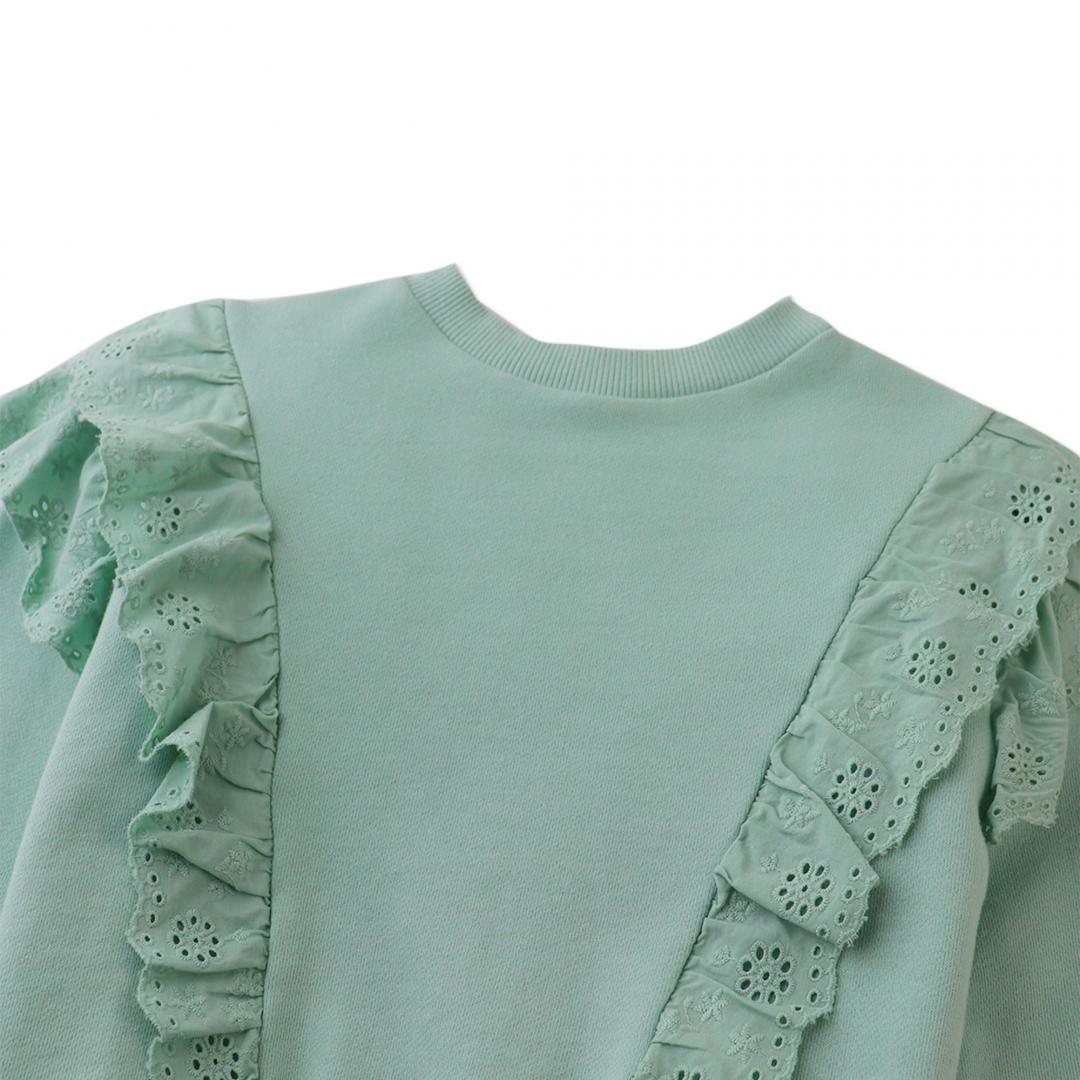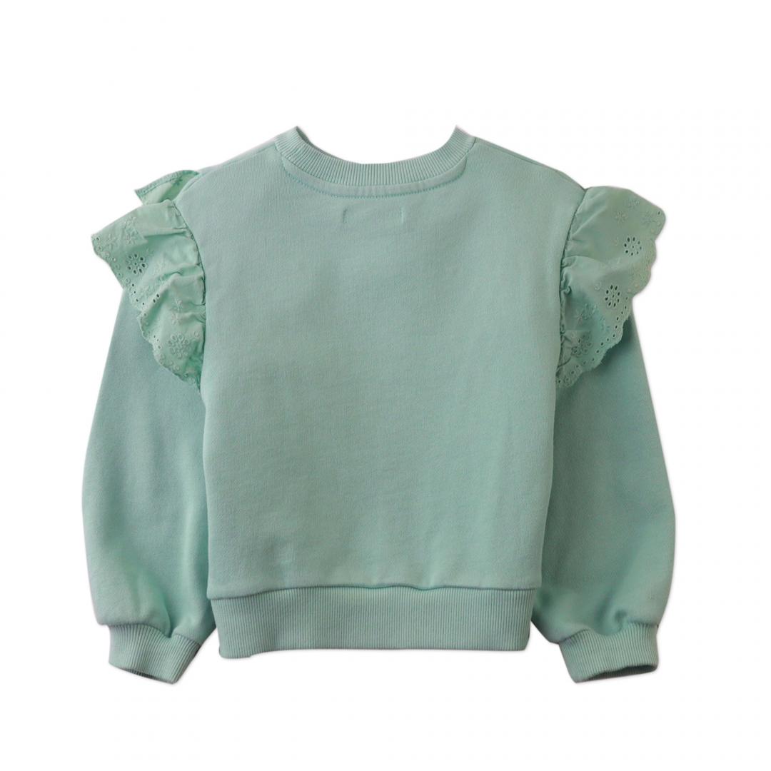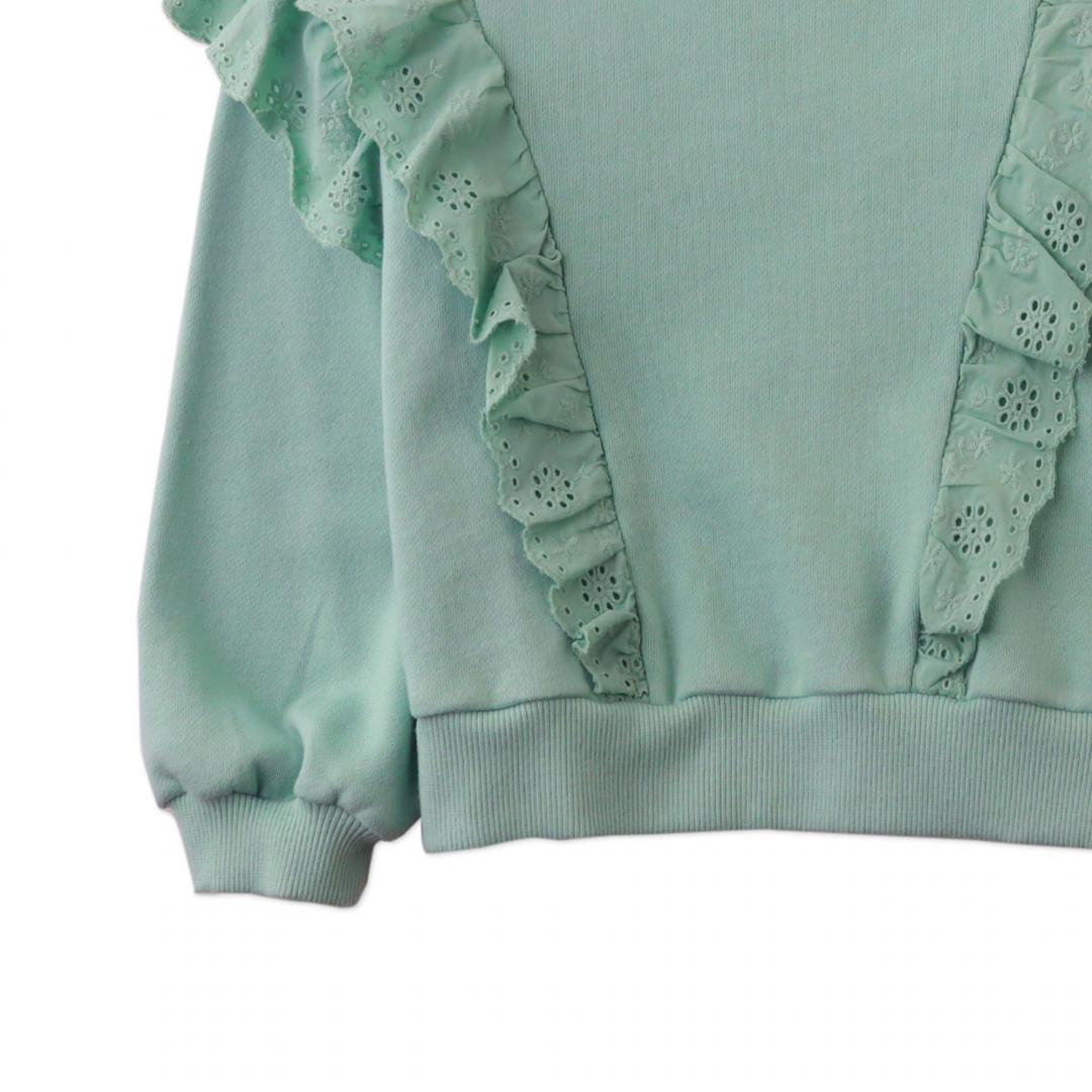 The Amalia Pullover in Seafoam Green, featuring ruffled eyelet trim on the body and sleeves, brings a serene, countryside charm to your child’s outift