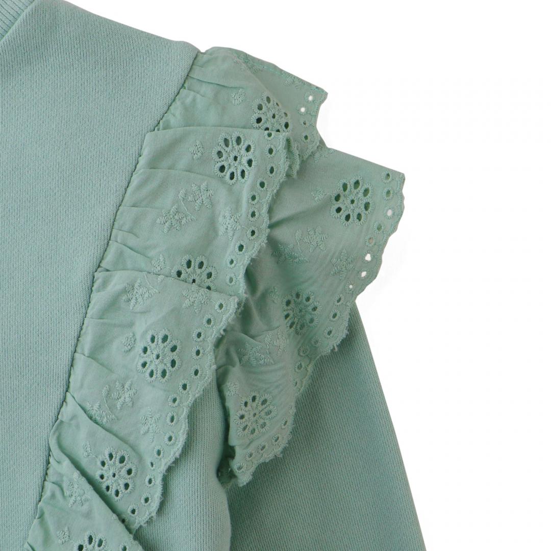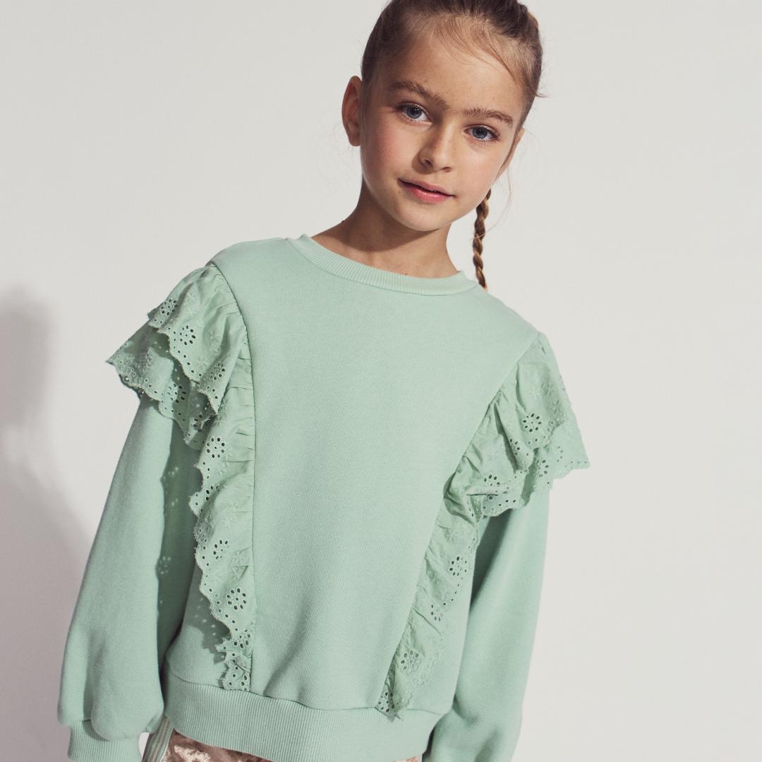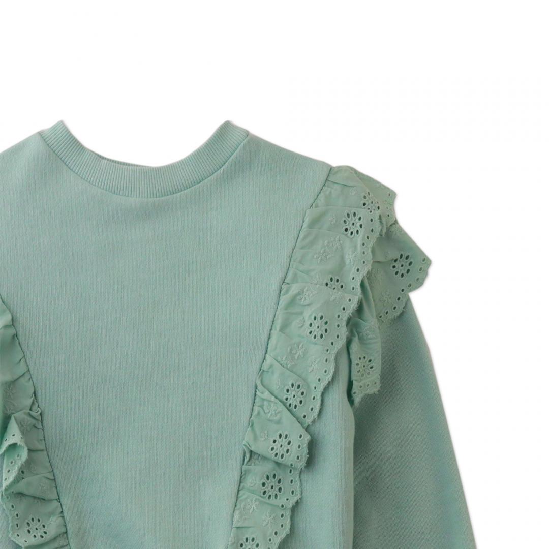 The Amalia Pullover in Seafoam Green, featuring ruffled eyelet trim on the body and sleeves, brings a serene, countryside charm to your child’s outift