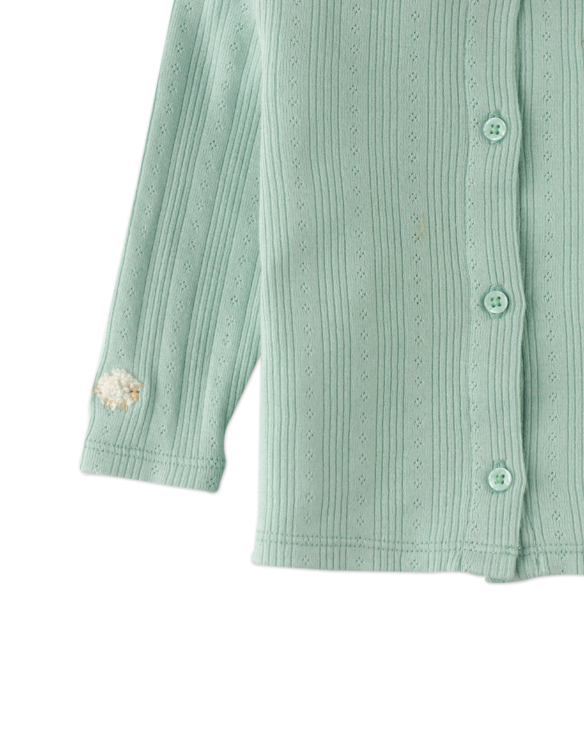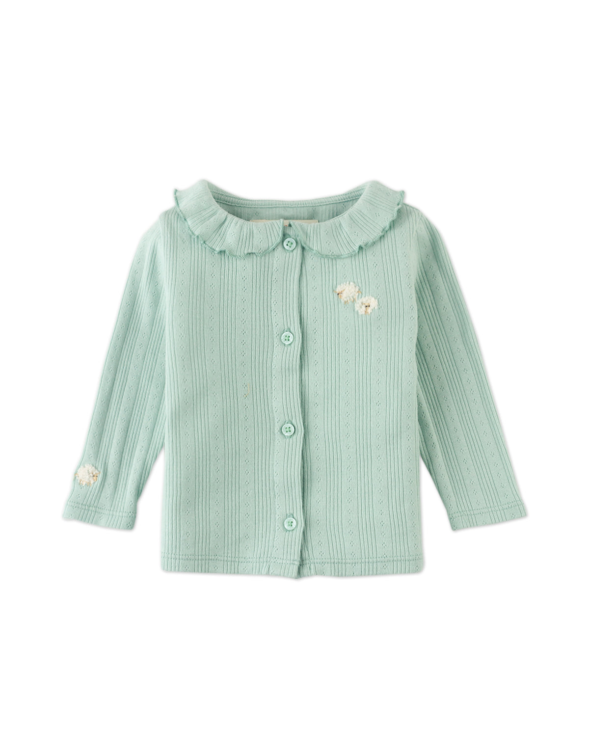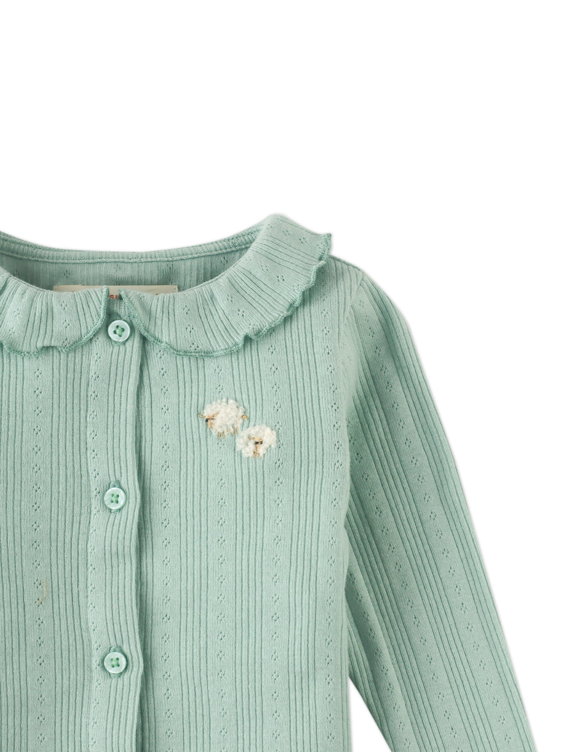 Capture the serenity of countryside cabins with the Baby Agie Long Sleeve Top in green, featuring tiny sheep embroidery on the collar for a peaceful and charming addition to your little one’s wardrobe.