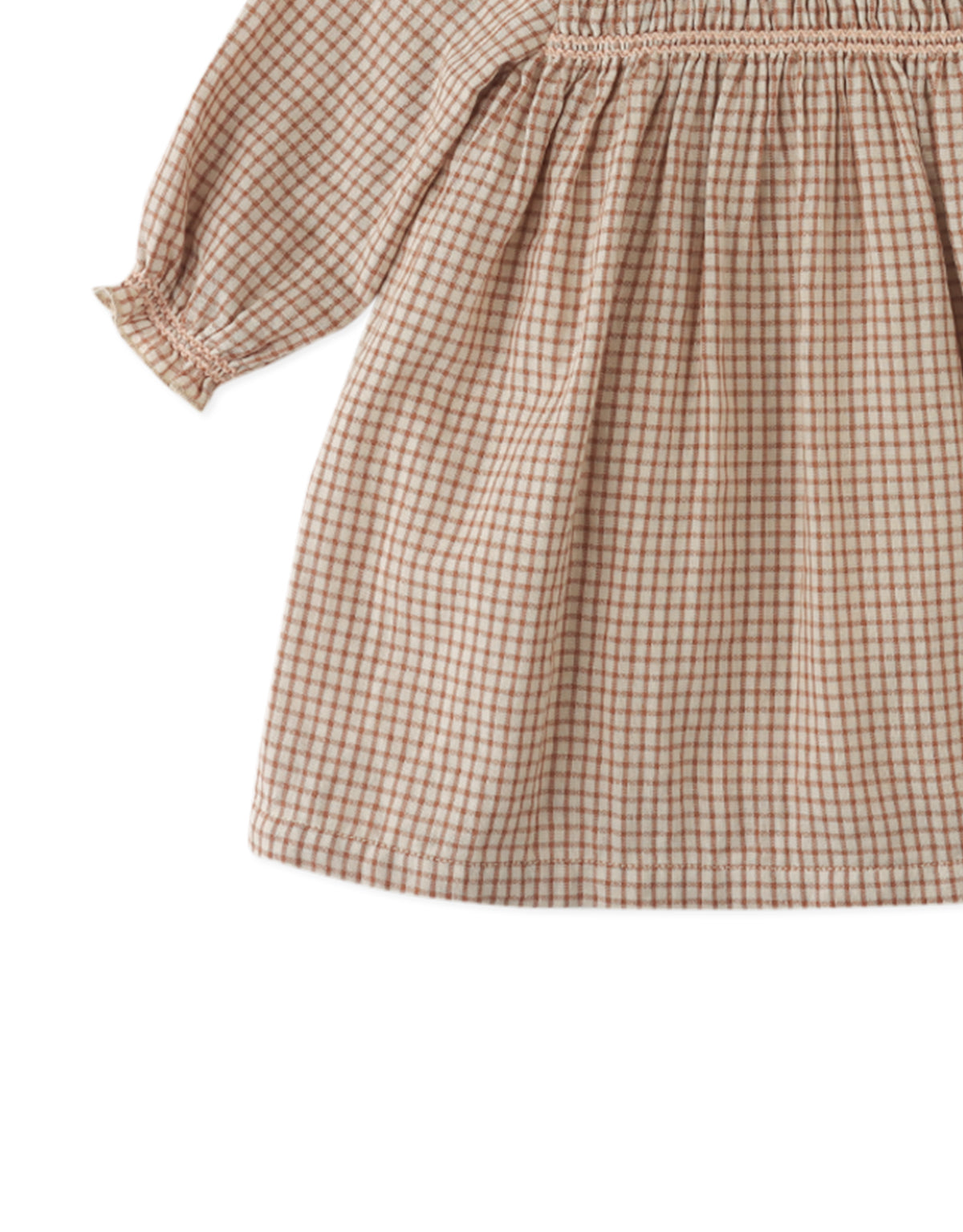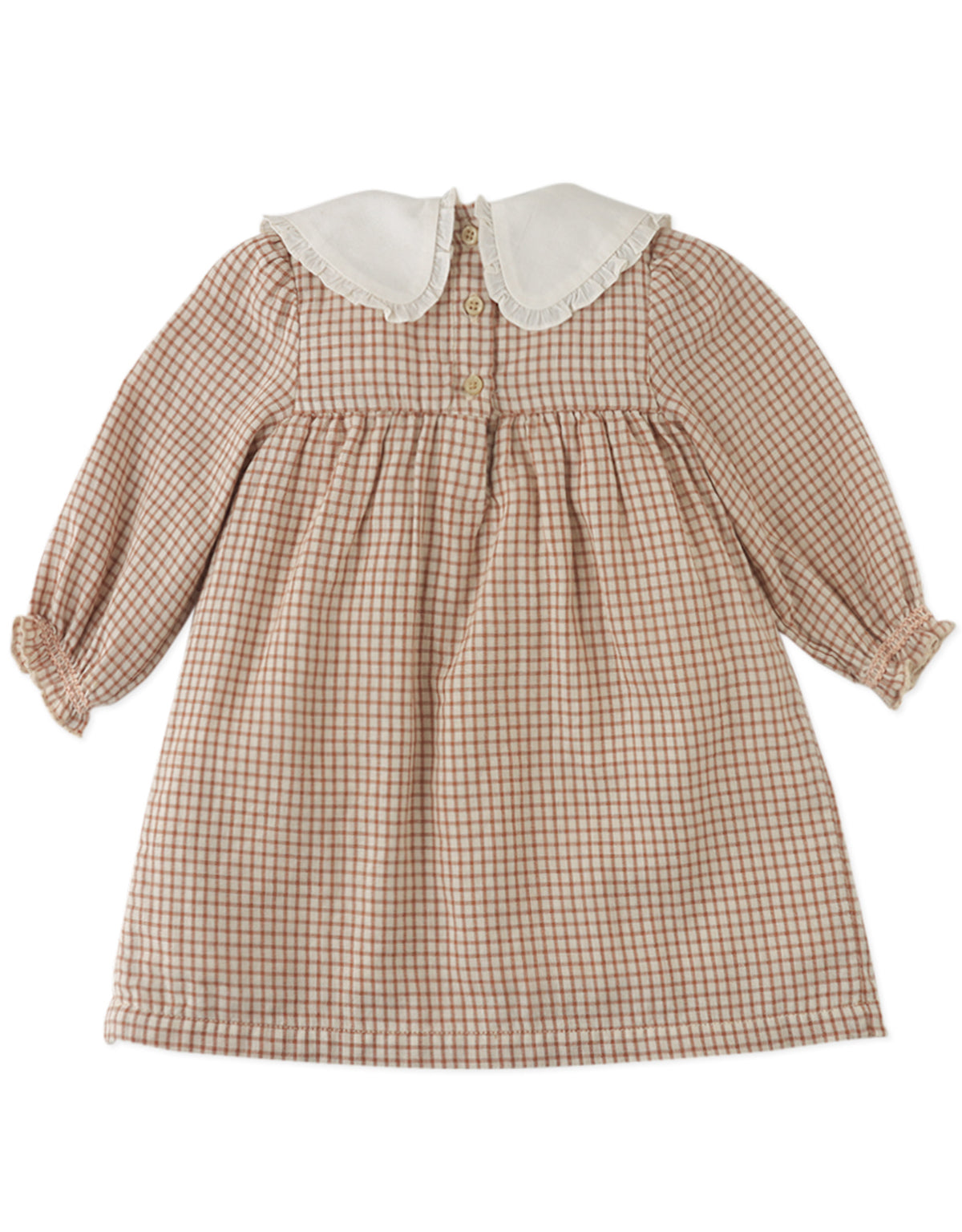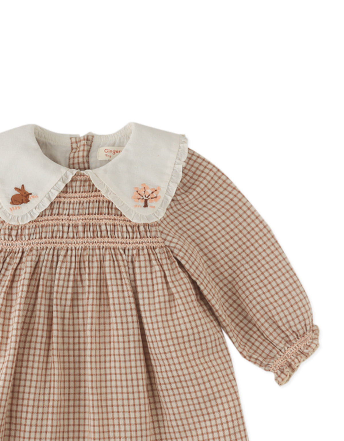 Dress your little one in the whimsical Baby Jonesy Smocked Dress in Sutherland, featuring adorable bunny and tree embroidery on the collar for an enchanting look.