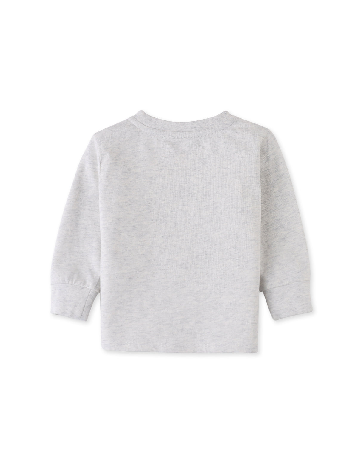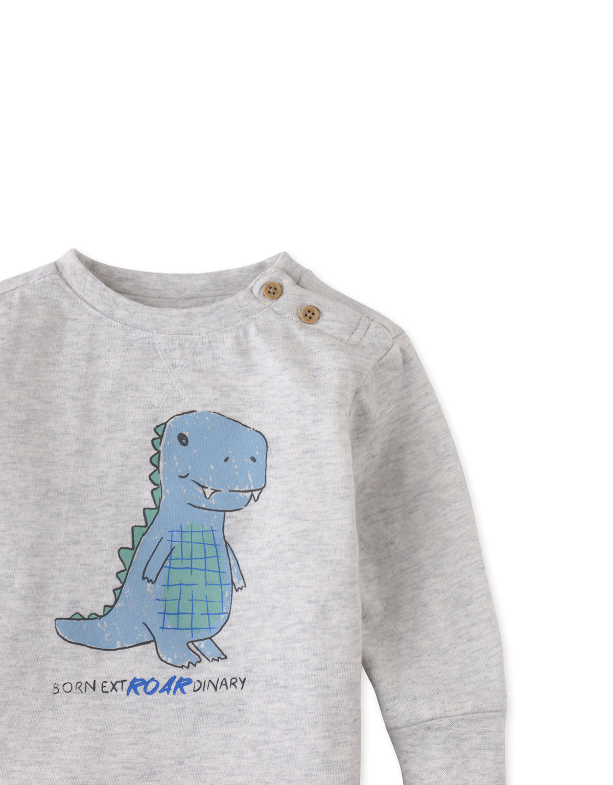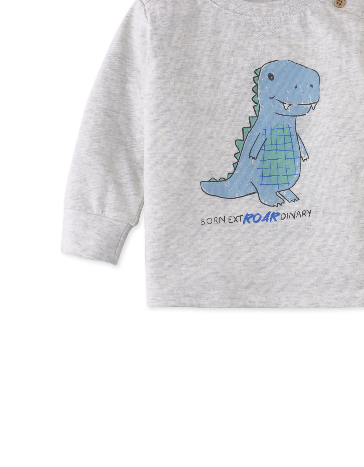 Make a roaring statement with our Baby Kael Long Sleeve T-Shirt in gray melange, featuring our Extraordinary Dino print.