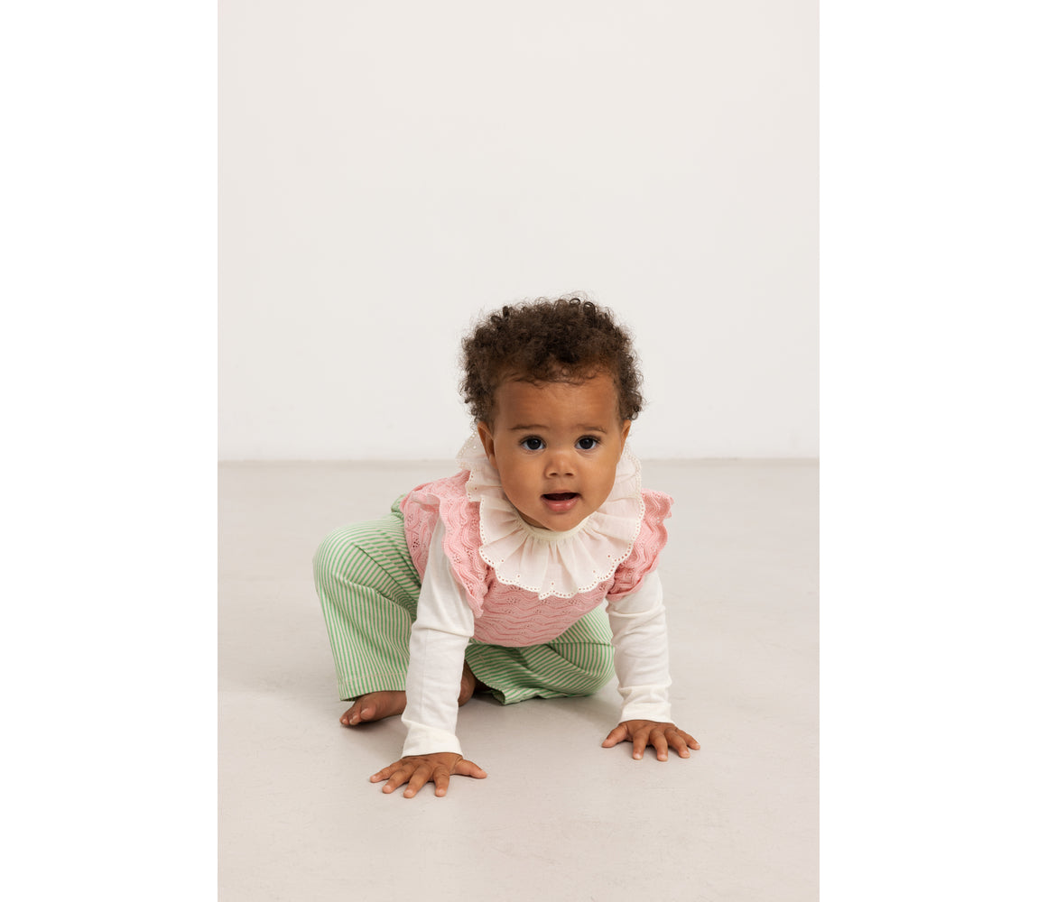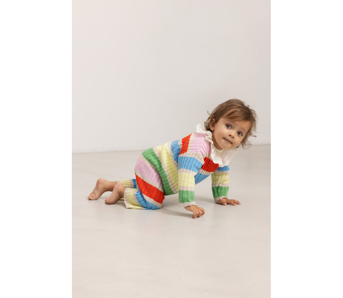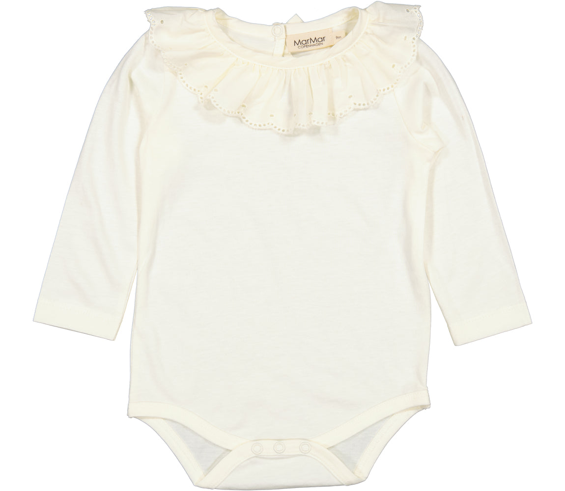 Long-sleeved bodystocking with a round collar and lace details. The bodystocking closes with buttons at the back. The bodystocking is soft, stretchy and comfortable to wear.