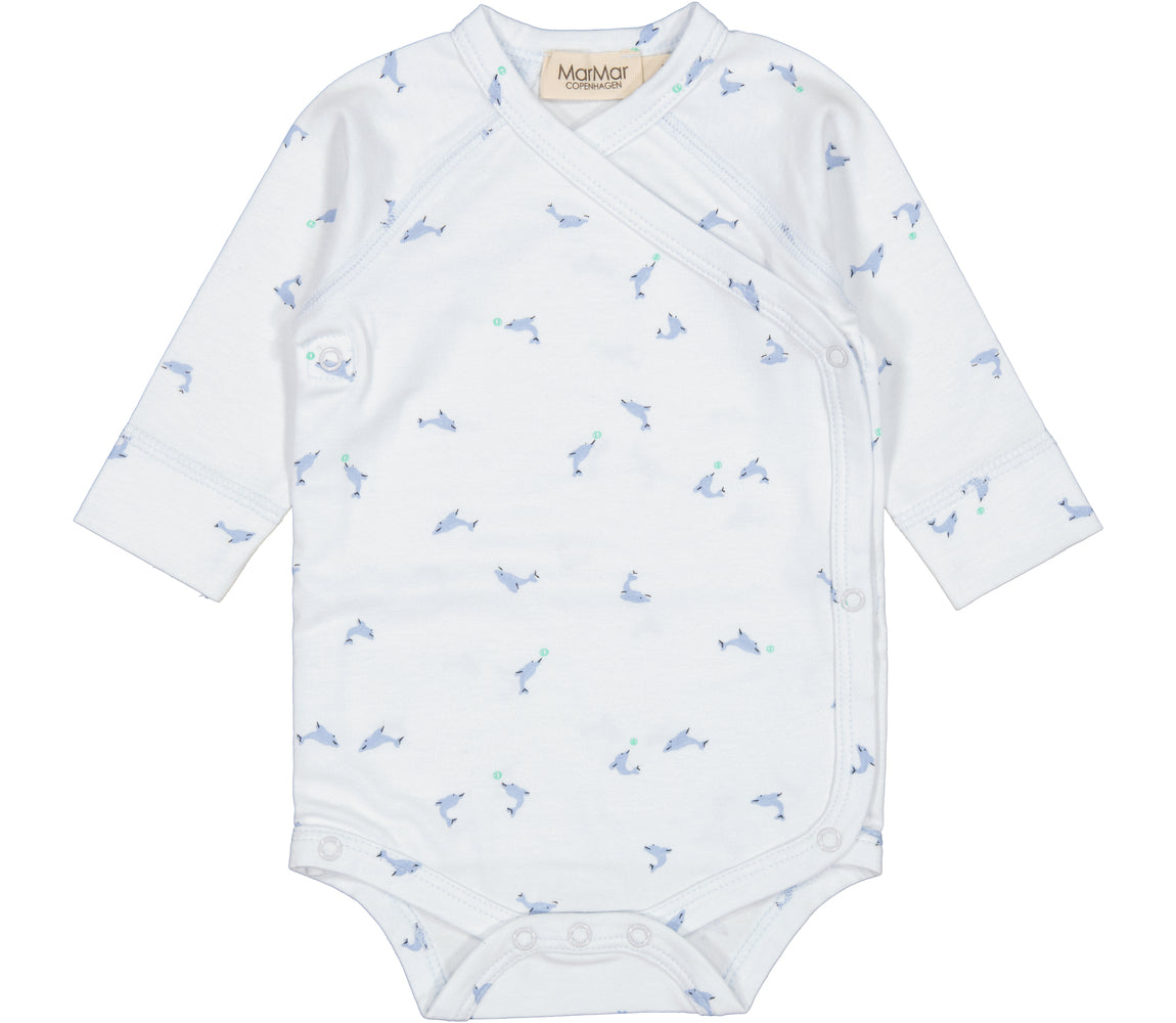 Long-sleeved bodystocking for newborns with a wrap-around closure and a cute dolphin print. The bodystocking closes with snaps and ties, has picot edges and is both soft, stretchy and comfortable to wear.