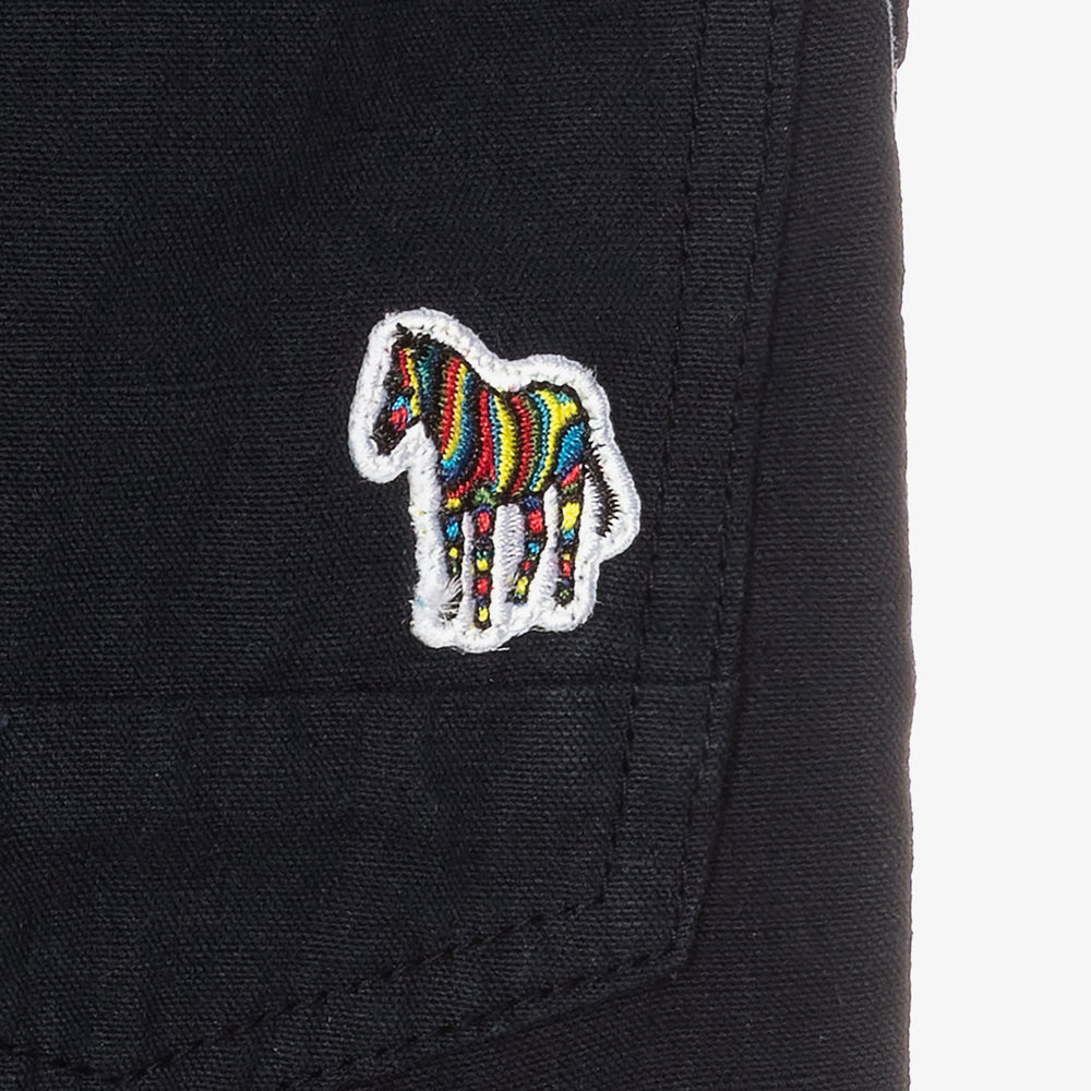 Navy blue chinos for boys by British designer Paul Smith Junior. Made in a linen and cotton blend, the pockets have contrasting blue stitching, with the brand's colourful striped Zebra logo badge on one of the back pockets. They have a comfortable elasticated waistband with a useful, colourful striped drawstring.