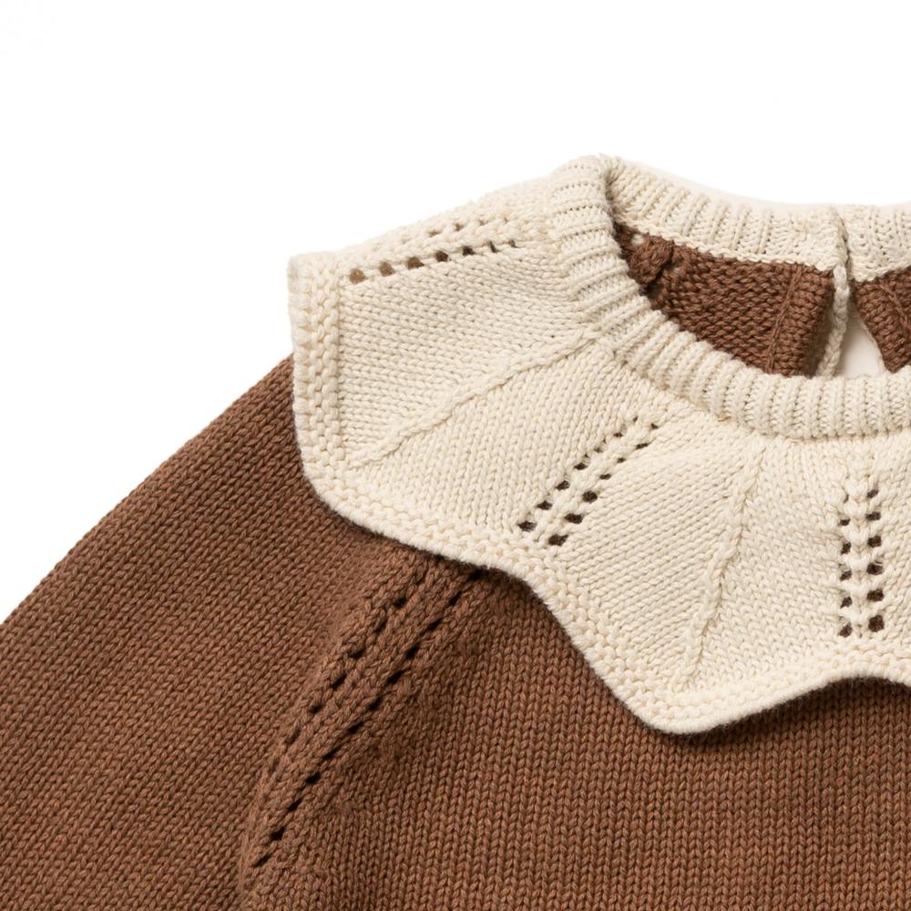 Brown dress with a home-knitted look, fine white lace collar and button closure at the neck.