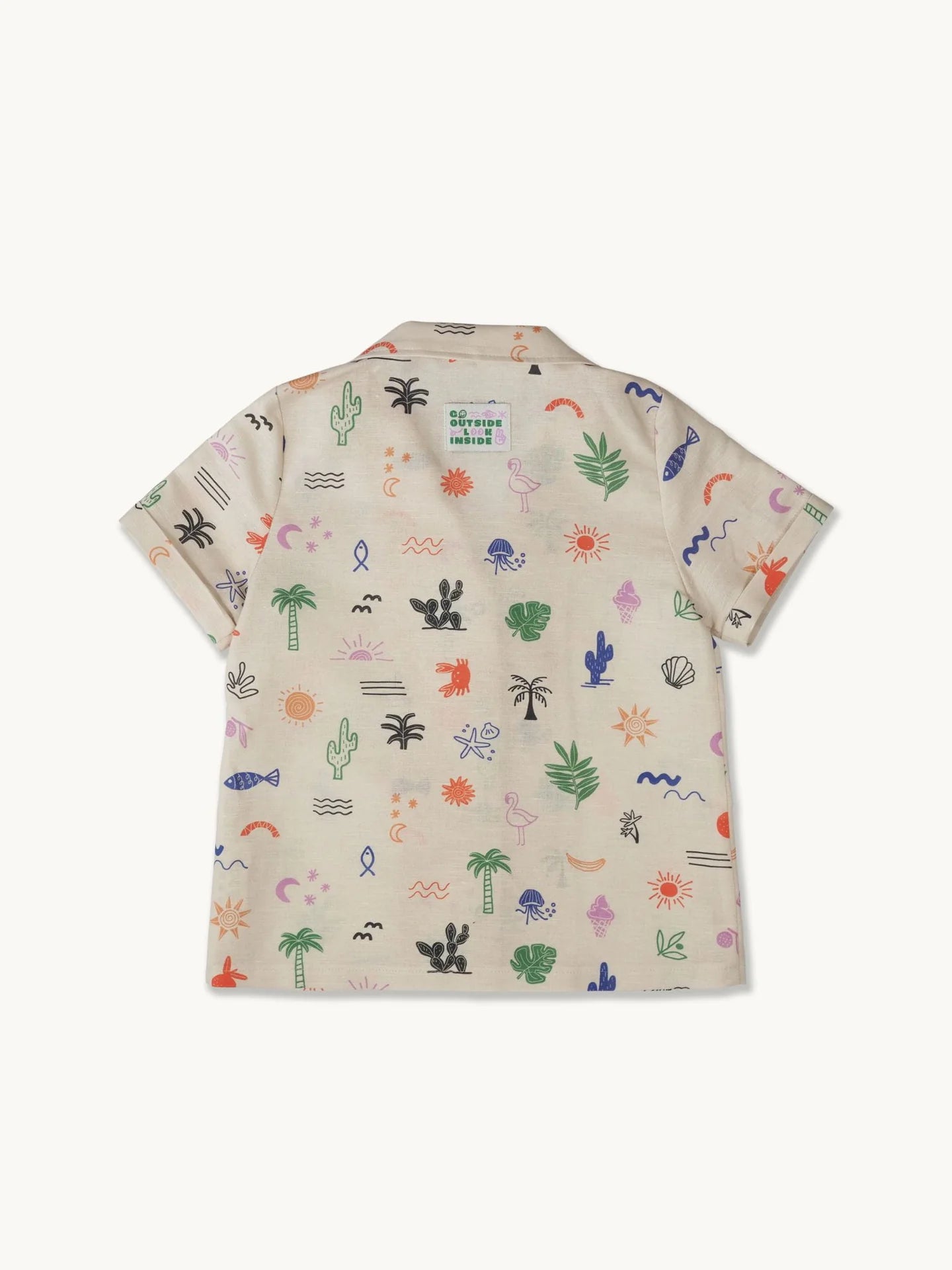 A linen shirt with a simple cut decorated with an original print. Fastened with snaps. The combination of linen and cotton is an ideal solution for summer days. Thanks to its lightness and airiness, the shirt will provide your child with comfort in the hottest weather. The shirt can be worn with shorts. Sewn in Poland.