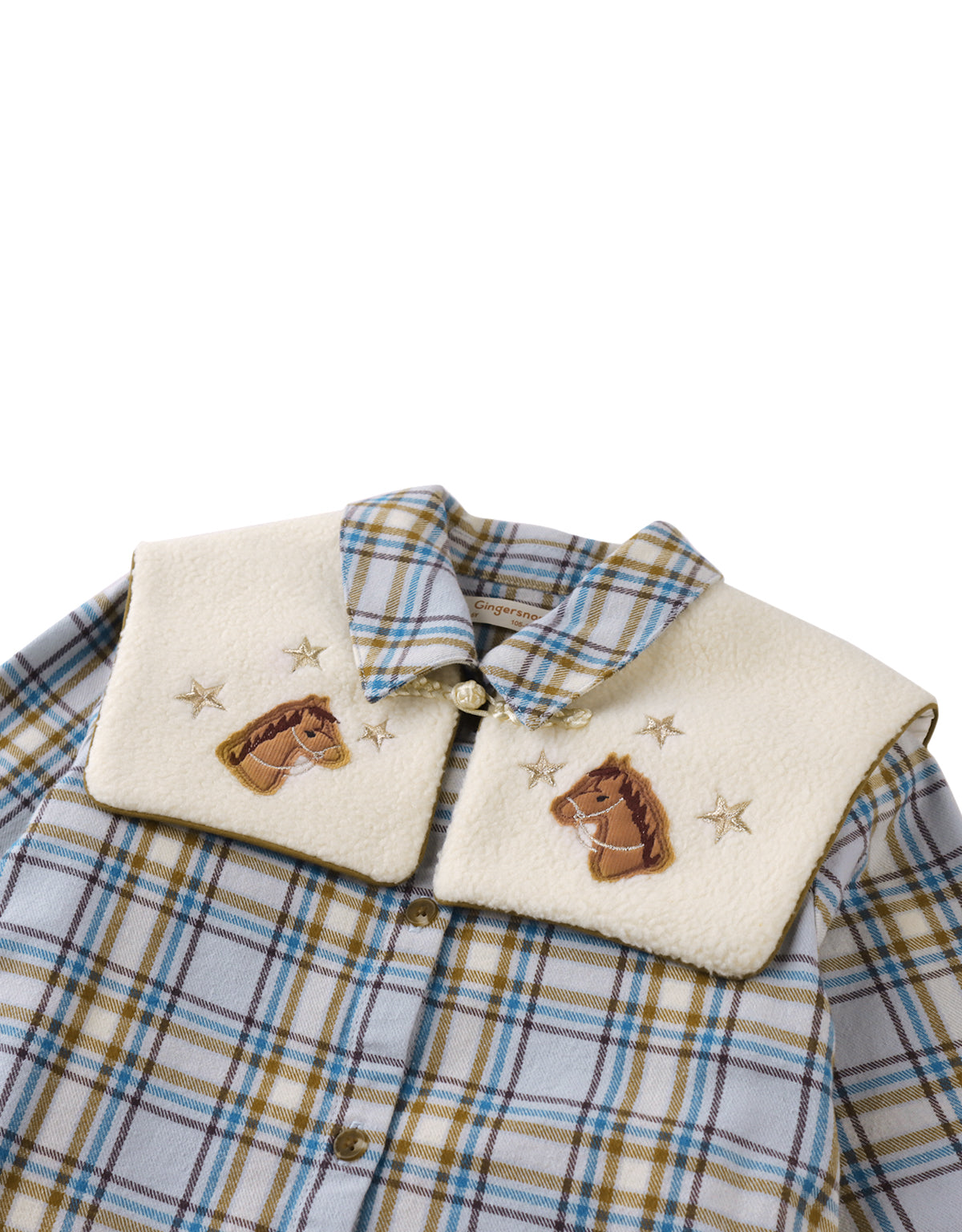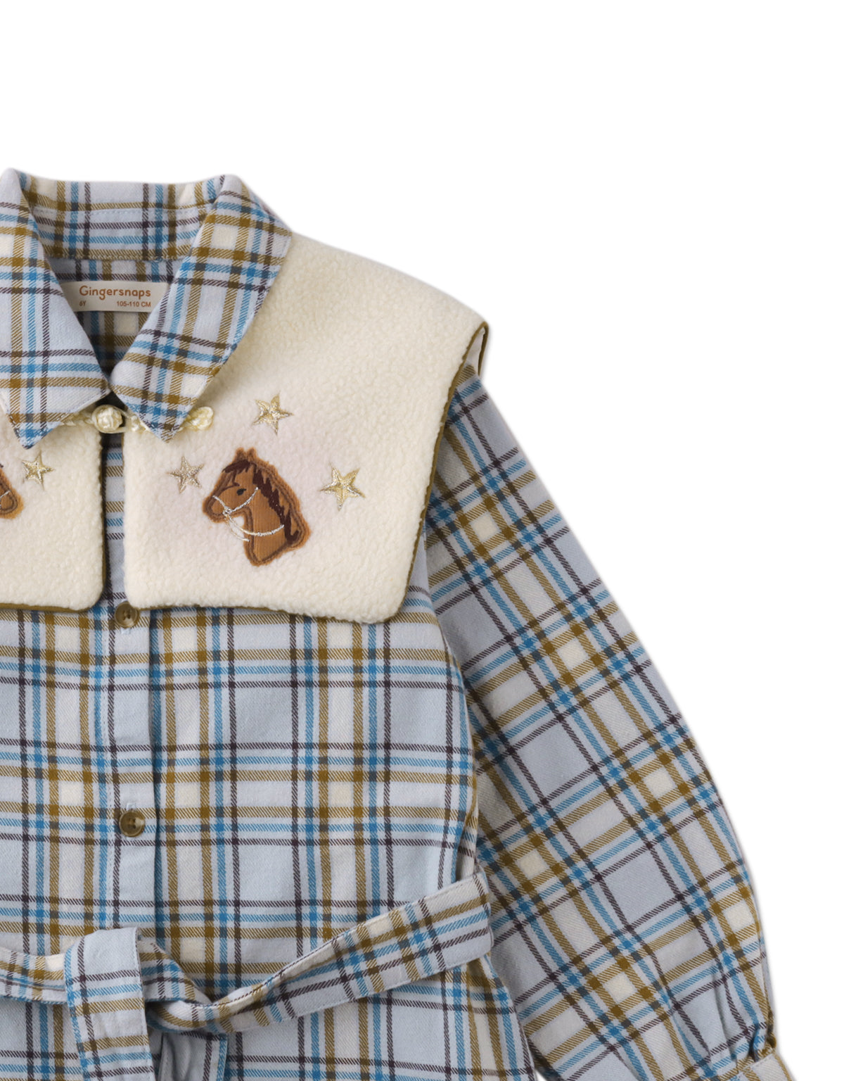 Inspire equestrian dreams with the Mildred Long Sleeve Shirt Dress in Preston Plaid, featuring a horse-embroidered detachable collar for a versatile addition to your little one’s wardrobe!