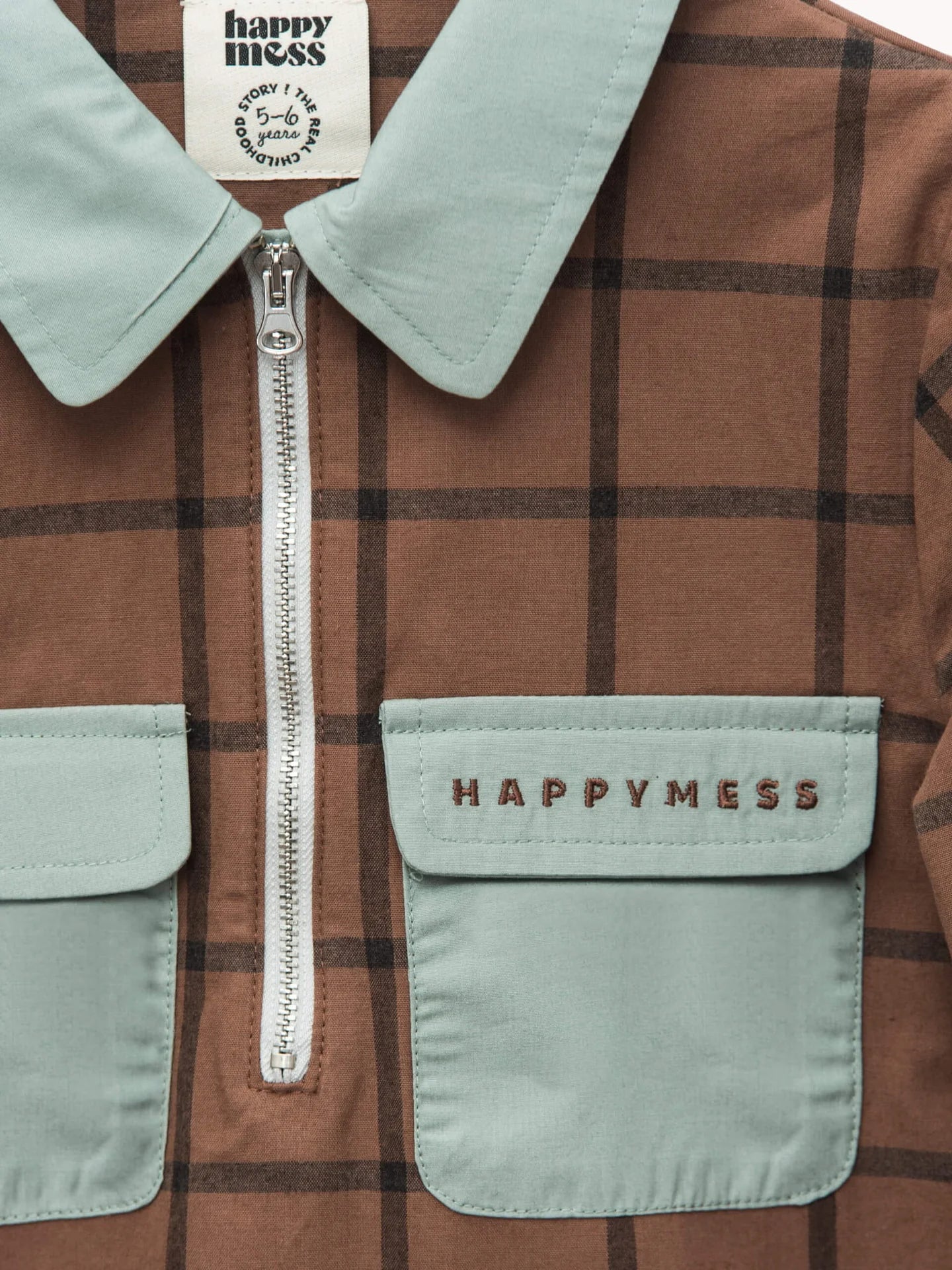 Cotton long sleeve checked shirt with a loose fit. Designed with a collar, embroidered pockets and cuffs on the sleeves. The shirt is longer at the back and has a zip fastening at the front. This design is our take on classic minimalism. We wanted to create a shirt for various occasions, while maintaining a childlike and carefree character and a comfortable form.