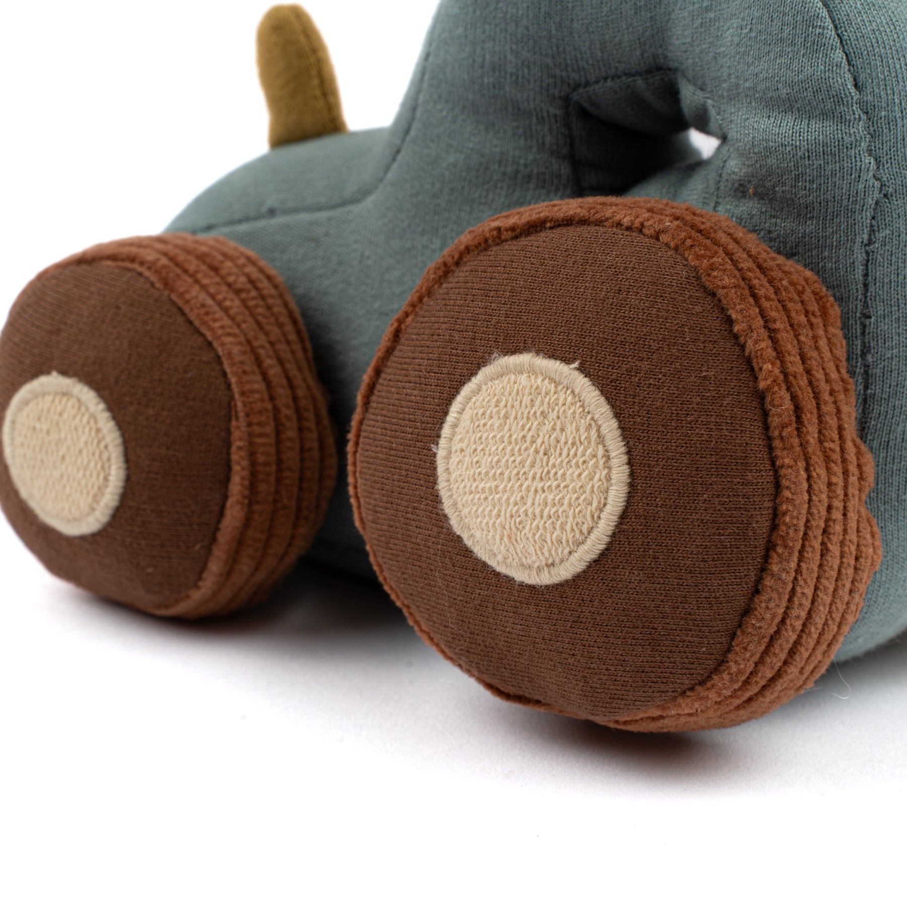 This tractor rattle is easy for little hands to hold and grip onto. The organic cotton fabric provides a soft and tactile texture, allowing your baby to explore different sensations as they grasp and shake the rattle.