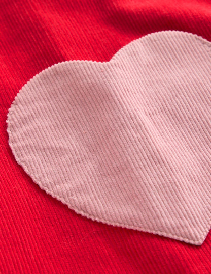Celebrate the simple things in life like cute heart patch pockets that will hold small things Minis like to keep close. And this pinafore is cord, which equals cosy.