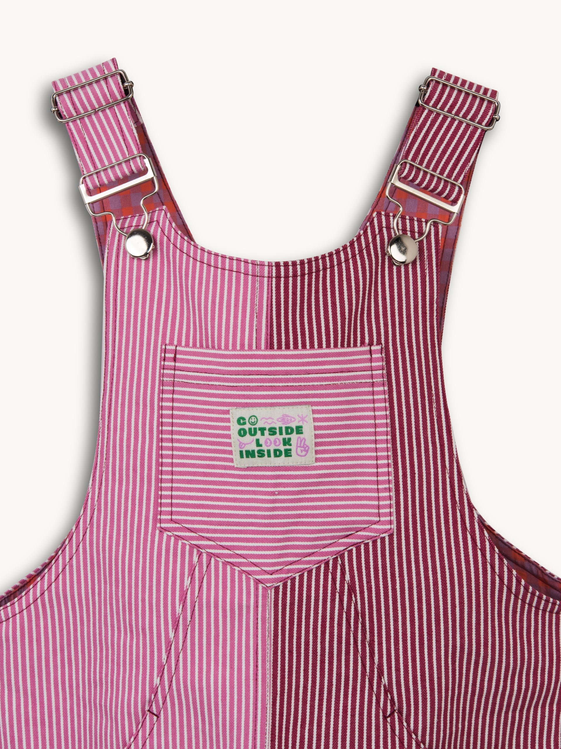 Loose fit striped dungarees with adjustable straps and buckle fastening. Designed with side and back pockets, contrasting colours and a fine check lining. Knee length.