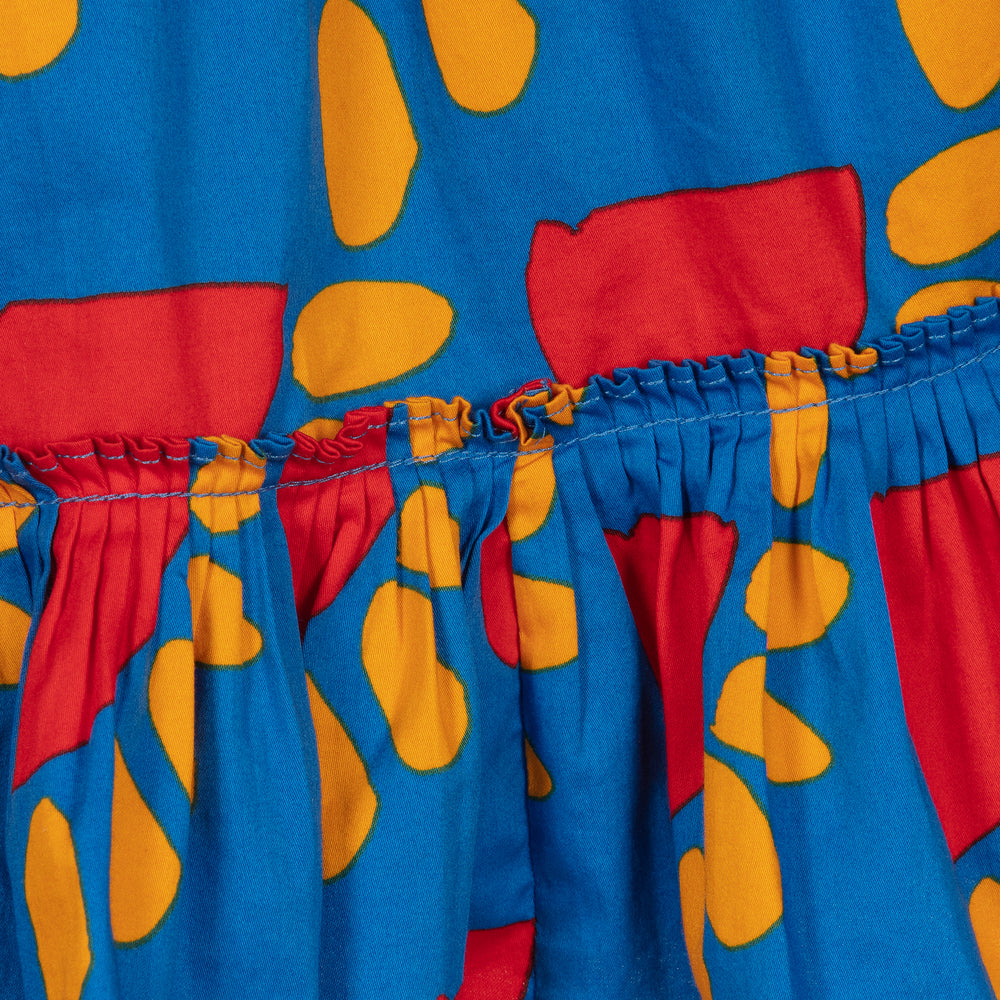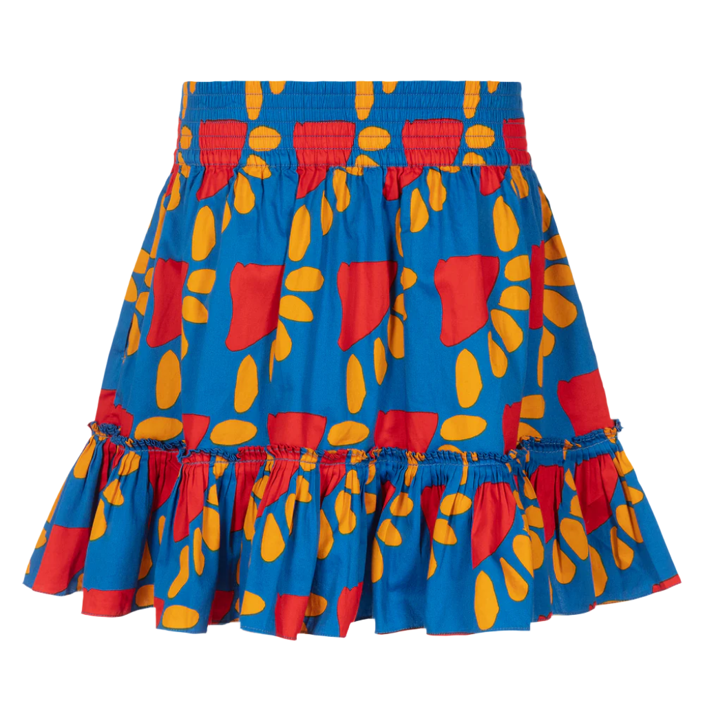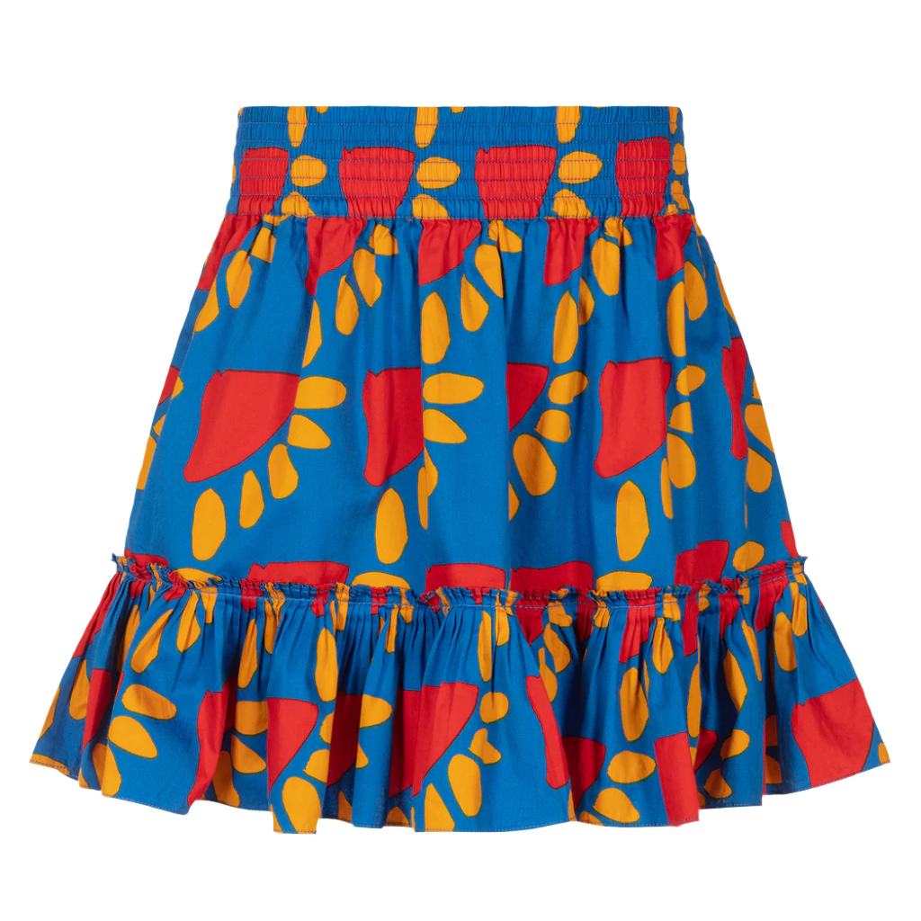 Eye-catching bright blue skirt for teen girls by Stella McCartney Kids, with a red and orange sun pattern print. Comfortable and easy to wear, it is made in lightweight organic cotton with an elasticated waistband, a pleated frill hem and concealed side pockets.