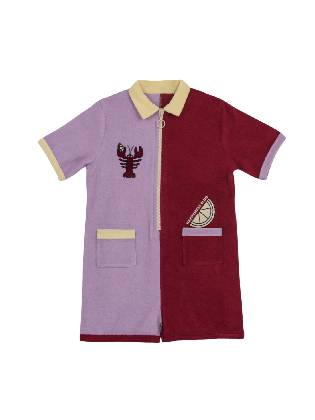 Cotton terry overall designed with short sleeves, zipper fastening and original embroideries. Light, breathable, nice to the touch. Loose fit allows room to move.