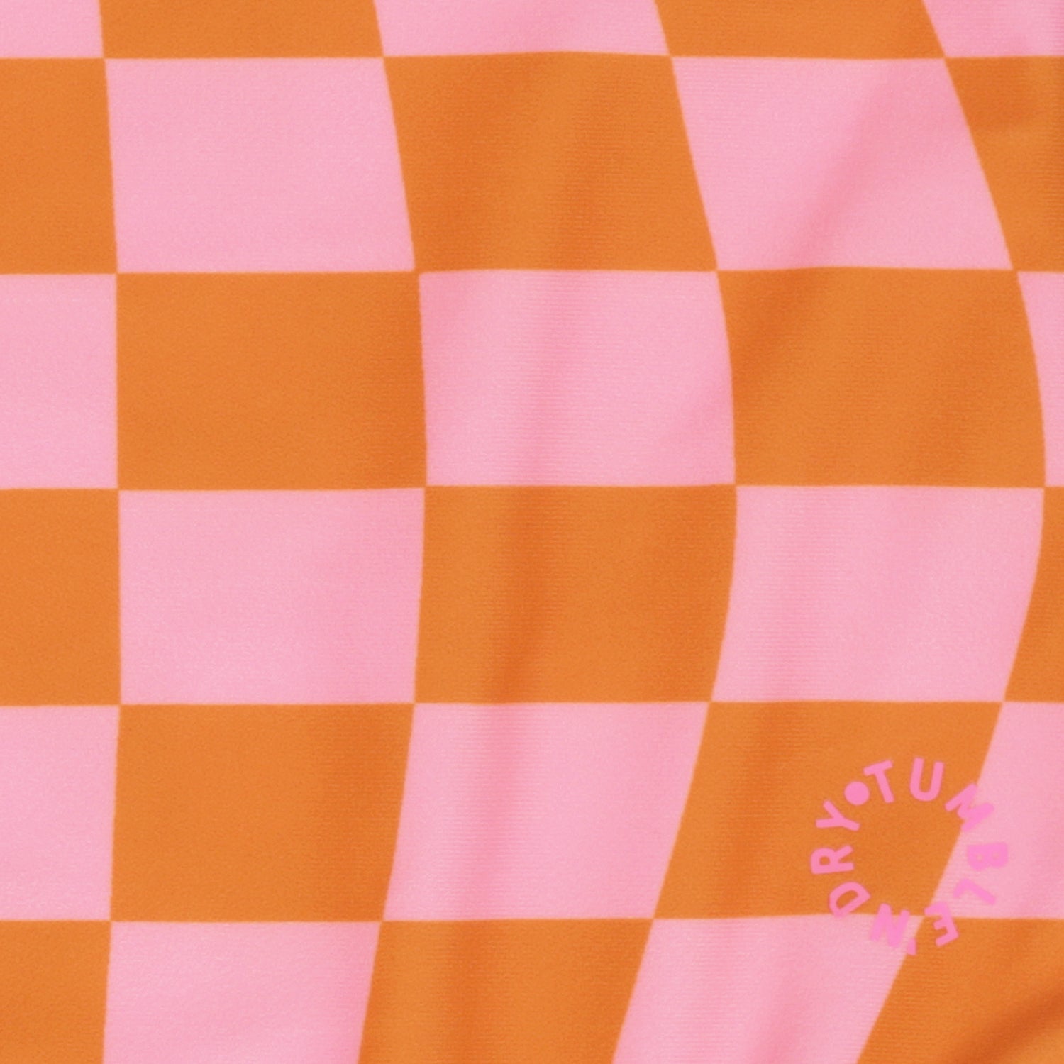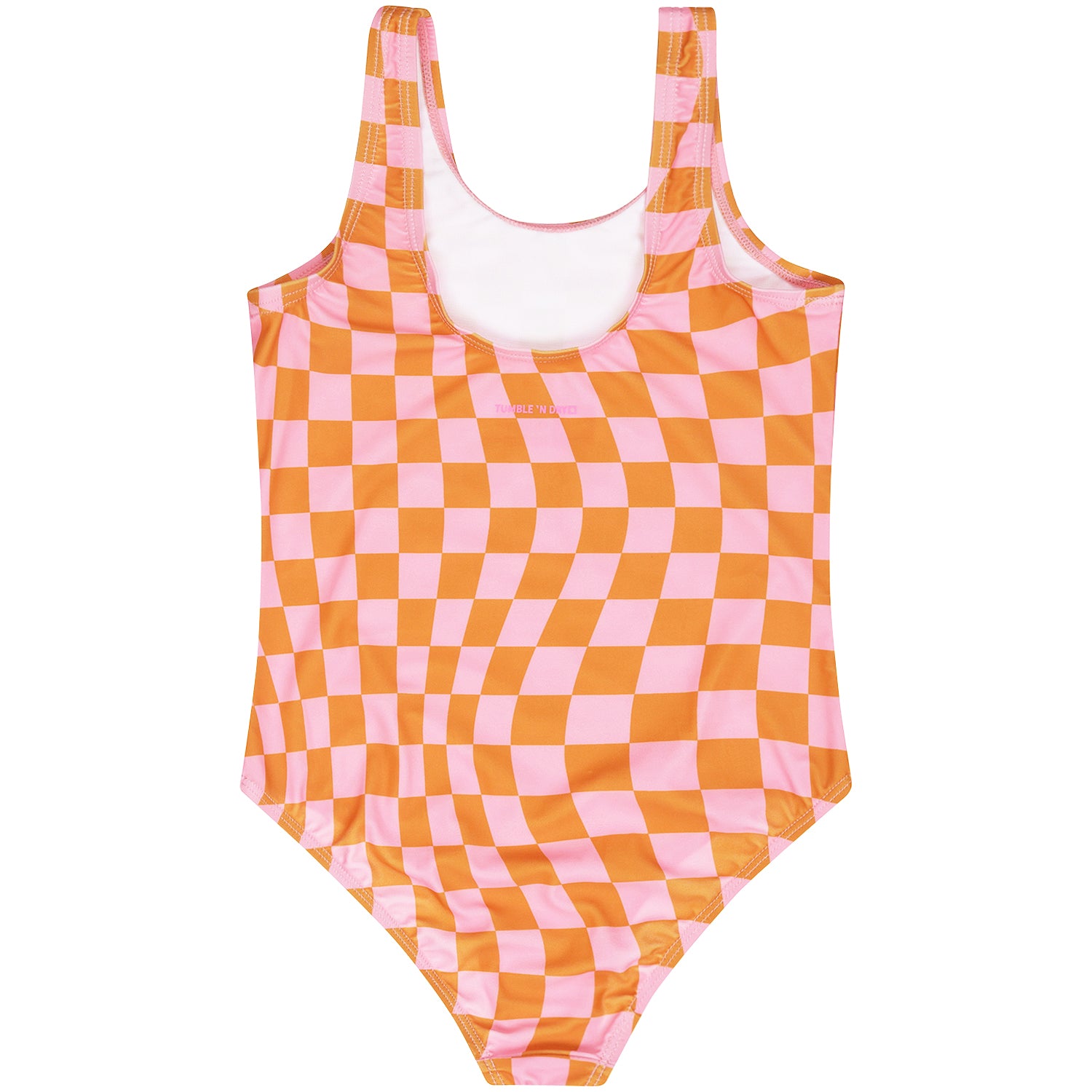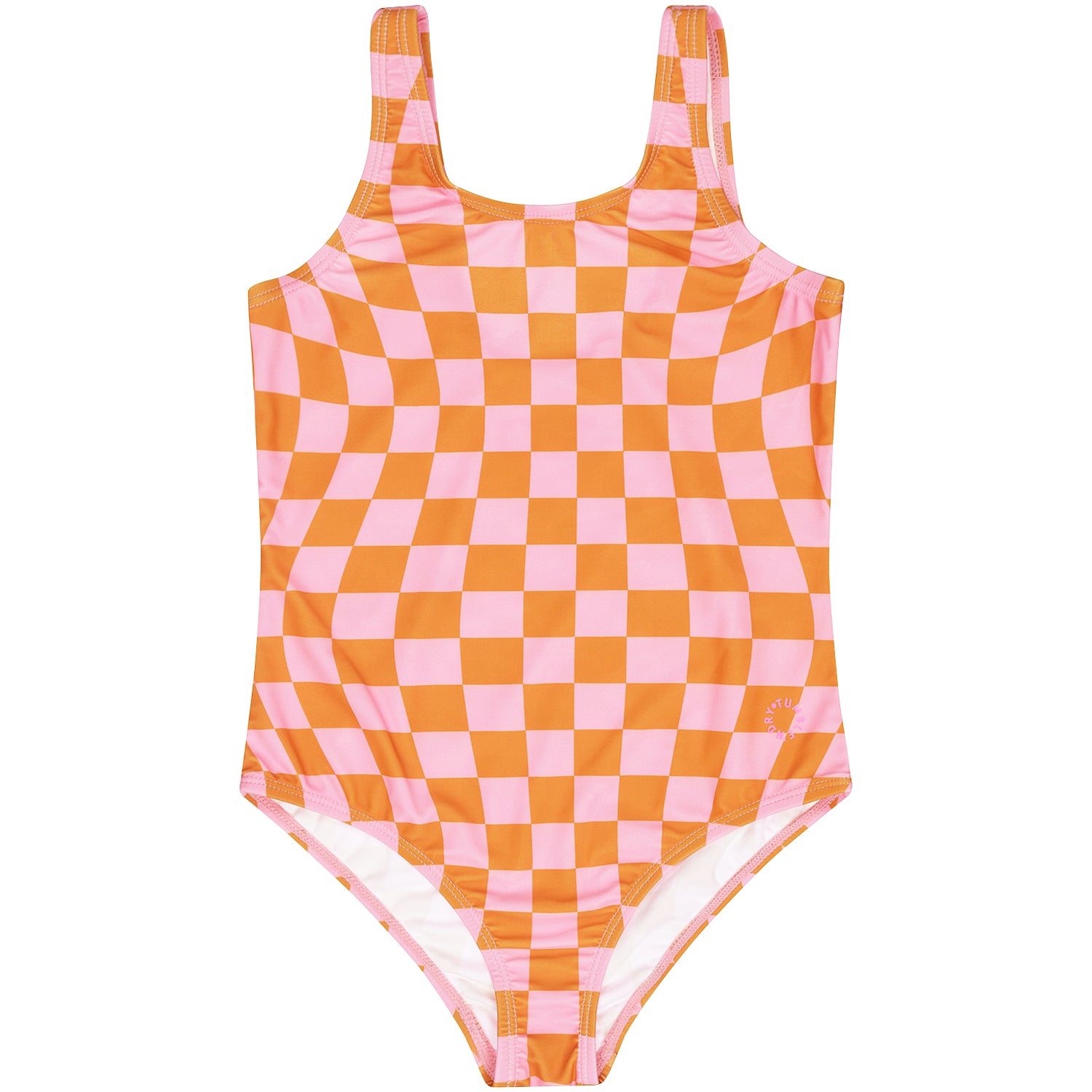 This cheerful girls' swimsuit is ideal for summer days at the beach or in the pool. The striking checker-board print in warm orange and pink tones gives it a playful and trendy look. With the wide shoulder straps it offers extra carrying comfort and support. This swimsuit combines a unique style with a nice fit, so that girls can move freely while swimming or playing. Available in double sizes, so you can always find the right fit. A stylish choice for sunny moments!