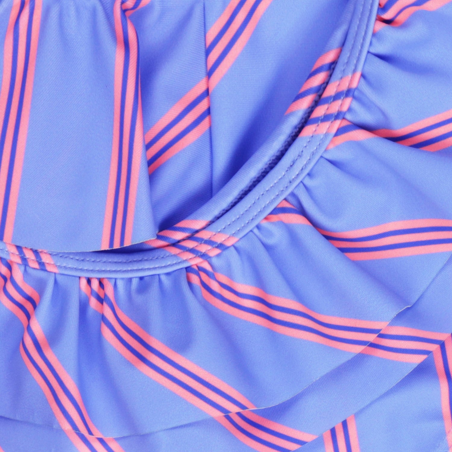 Discover this charming bikini for girls, designed for style and comfort on sunny days. The bikini features a playful blue and pink stripe print and is embellished with subtle ruffles on both the top and bottom, adding an extra touch of elegance. With a close fit and double sizing (86/192 - 158/164), this piece offers an optimal fit for different ages. Perfect for beach days or pool adventures, this bikini combines a timeless design with a high-quality finish that is suitable for active children.