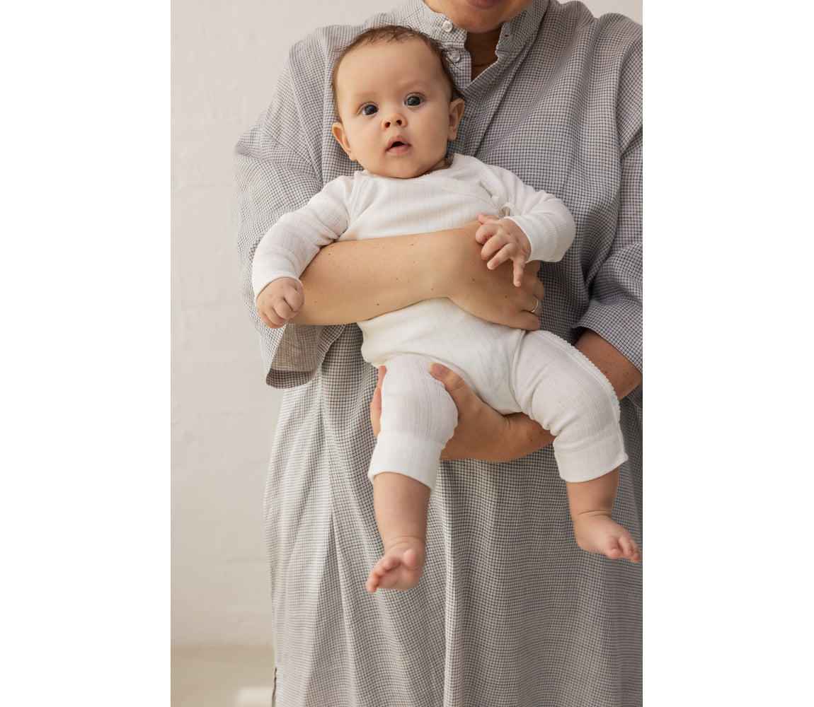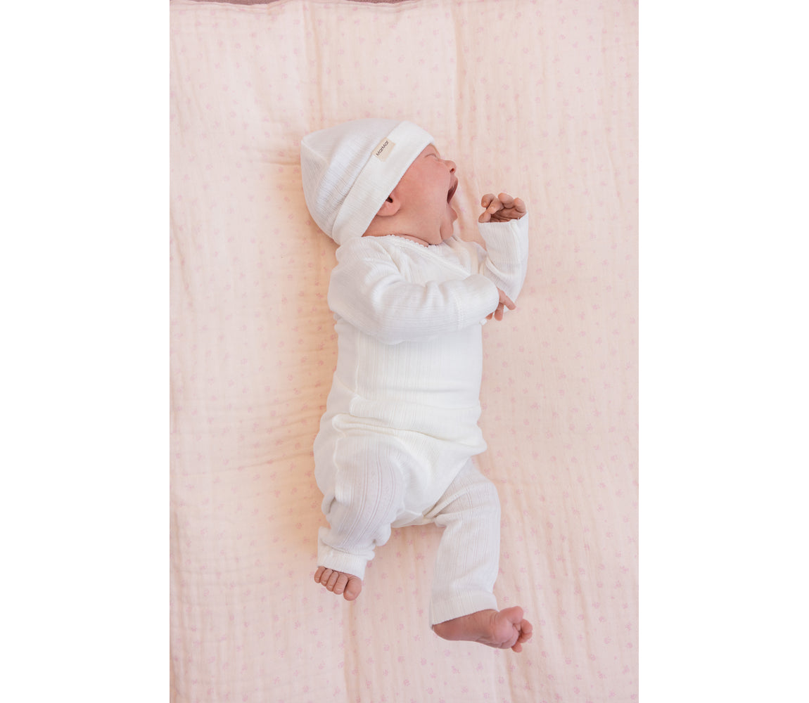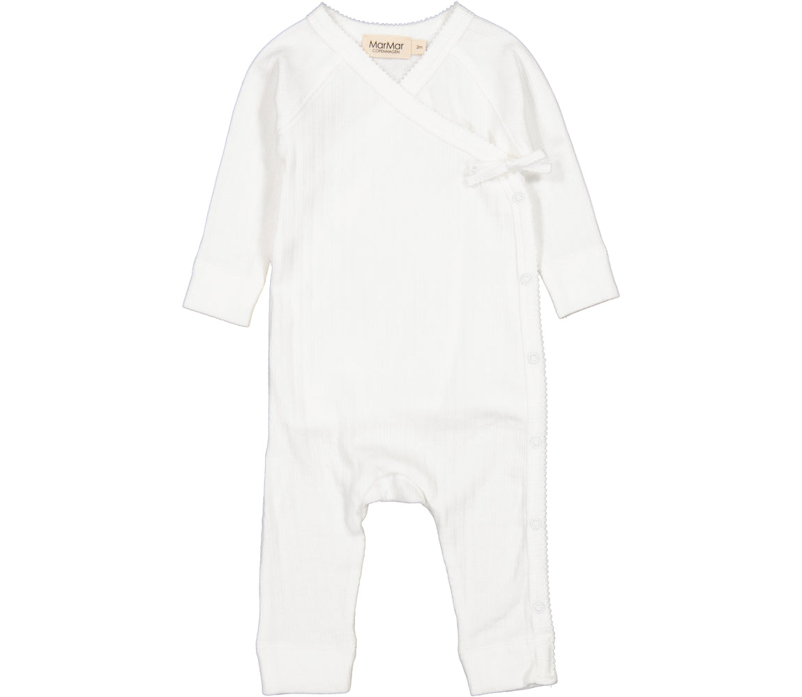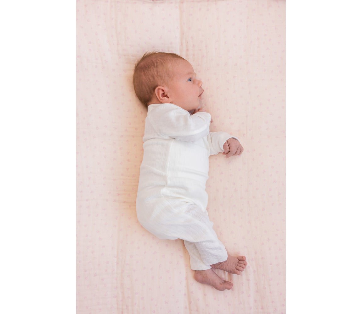 Long-sleeved pointelle jumpsuit for newborns. The jumpsuit has a wrap-around closure and closes with snaps and ties from the neck down one leg. The jumpsuit is soft, stretchy and comfortable to wear.