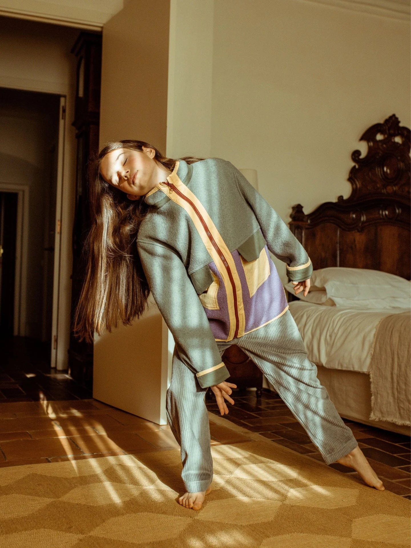 Wool jacket with cotton lining. Fastened with a zip on the front and sides. Designed with pockets and embroidery on one of them. The jacket is specially constructed to be worn for several seasons. Thanks to the roll-up sleeves and oversized cut, it grows with the child. Sewn in Poland.